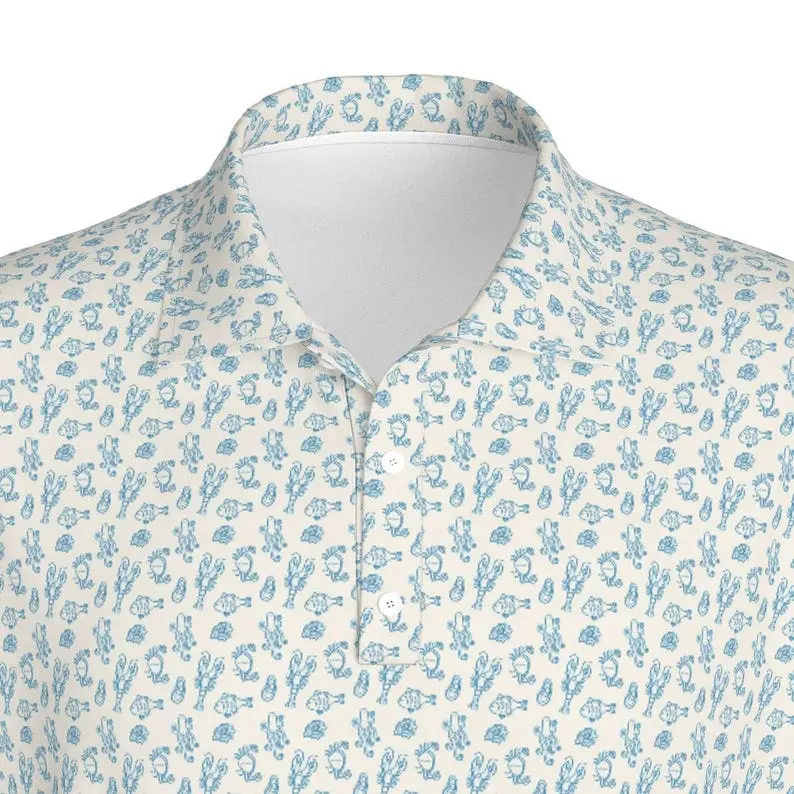 Seafood Pattern Golf Polo Shirt | Fun Fish Crab Lobster Athletic Polo for Him | Perfect for Golf, Tennis, and Pickleball