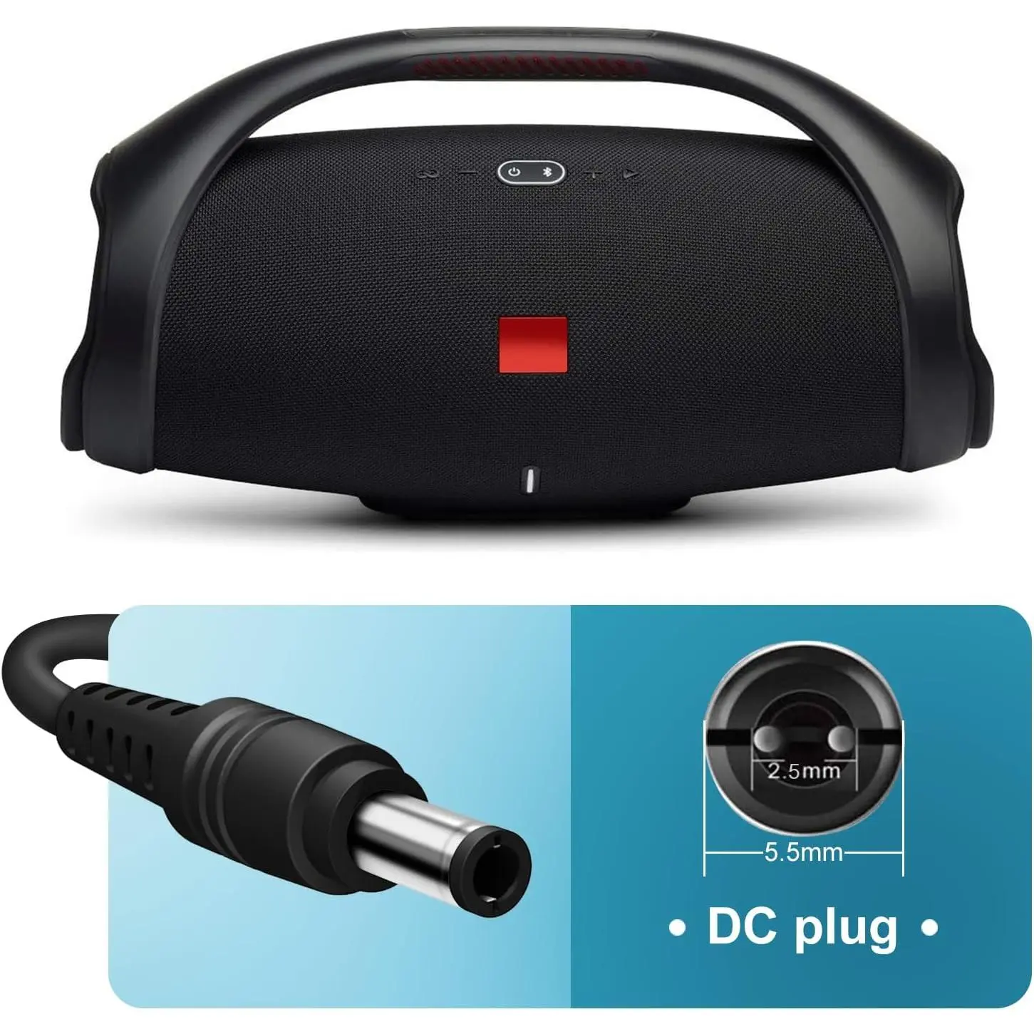 Connector Size: 5.5mm*2.5mm.Measuring 9 feet in total length to your speaker, the charging cord provides ample reach, ideal for indoor use.