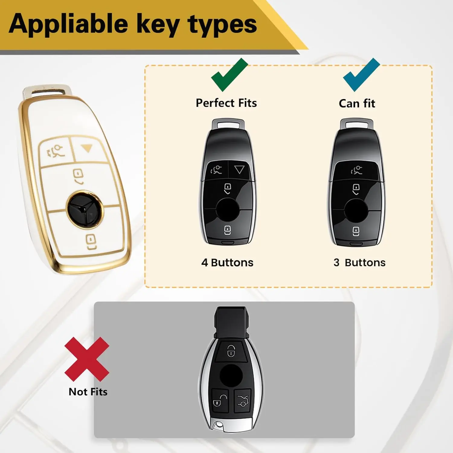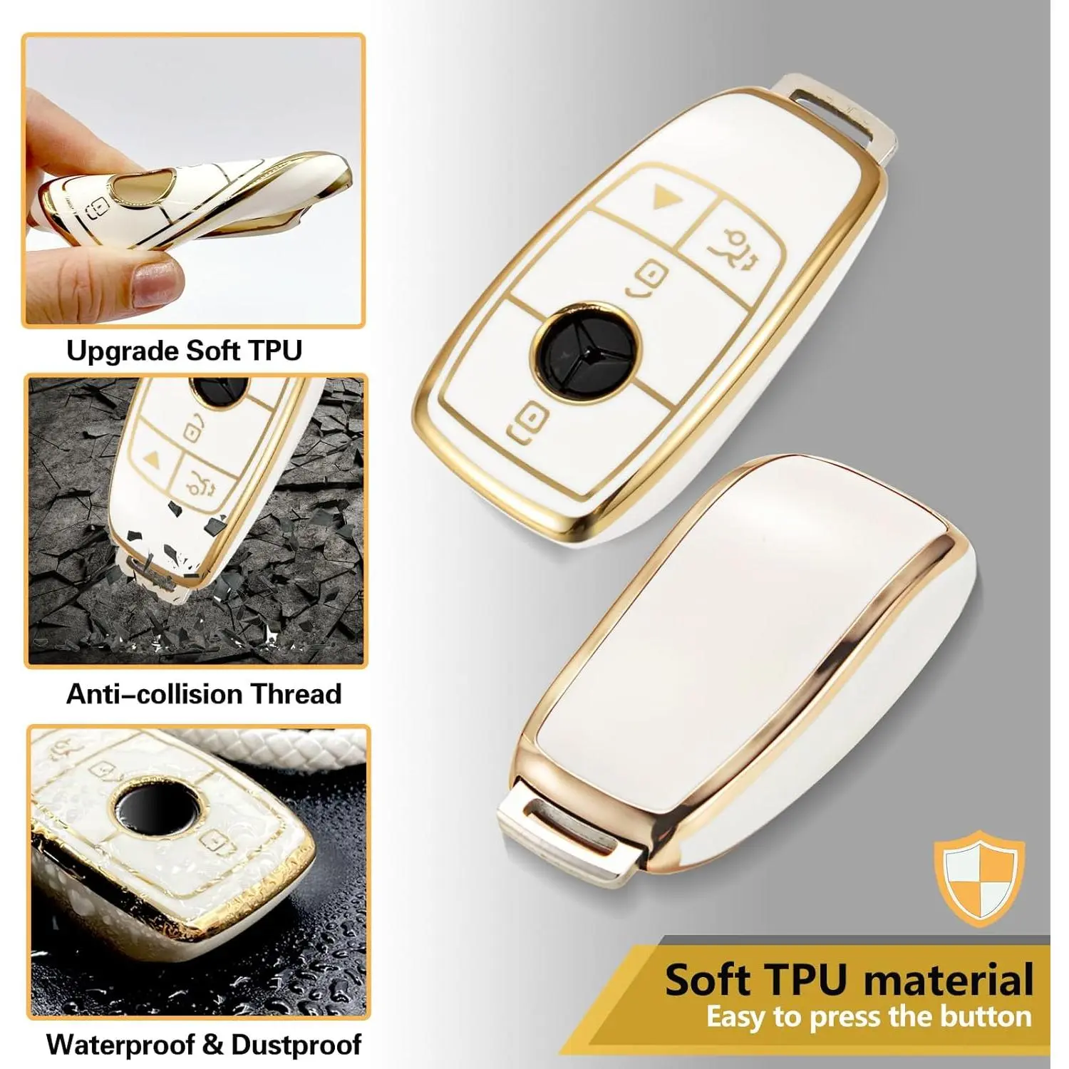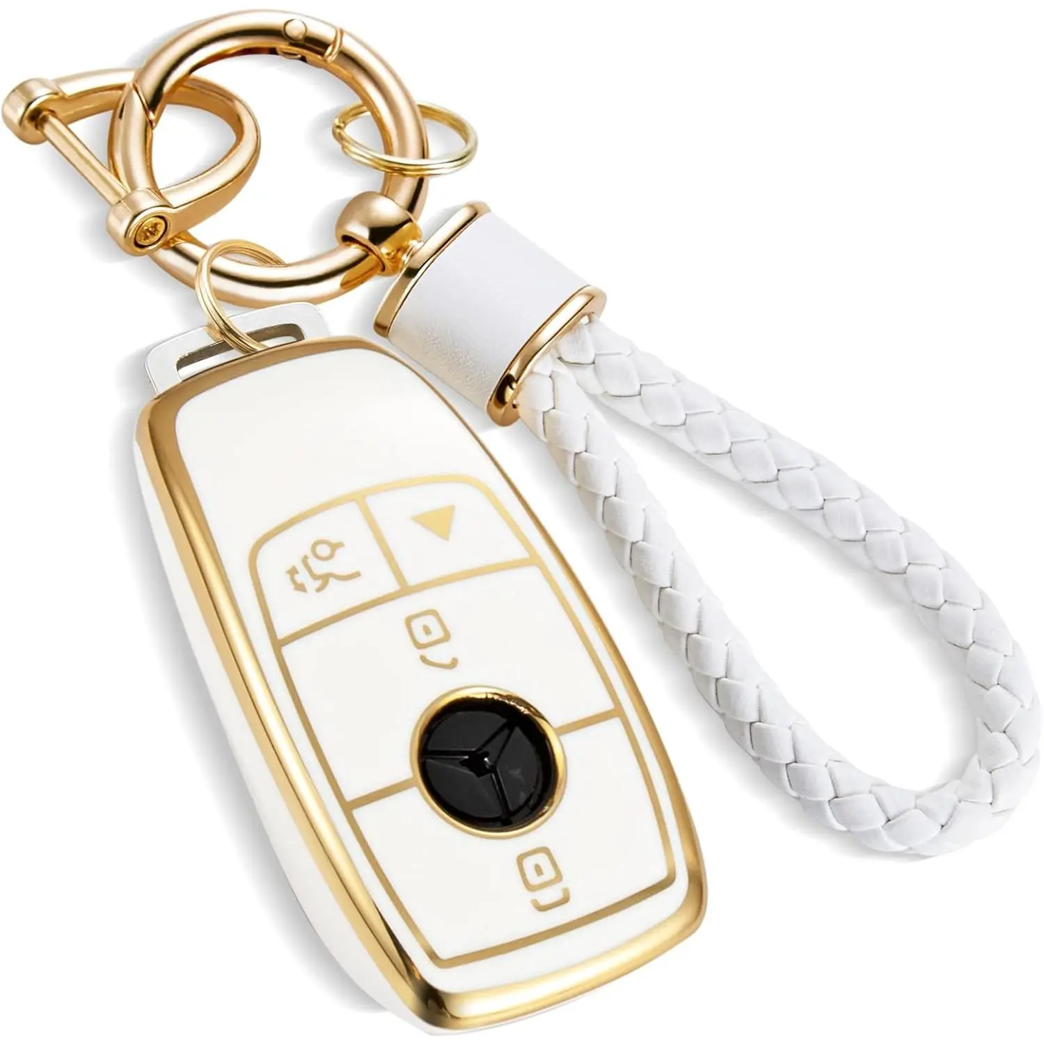 ✨ Elevate your key fob with this upgraded soft case! Designed for Mercedes-Benz models like GLC, GLE, GLA, GLB, GLS, AMG, A, G Class. It features a gold edge and a metal braided rope keychain. Perfect for 4-button key fobs. Enhance your car's look with this stylish accessory.