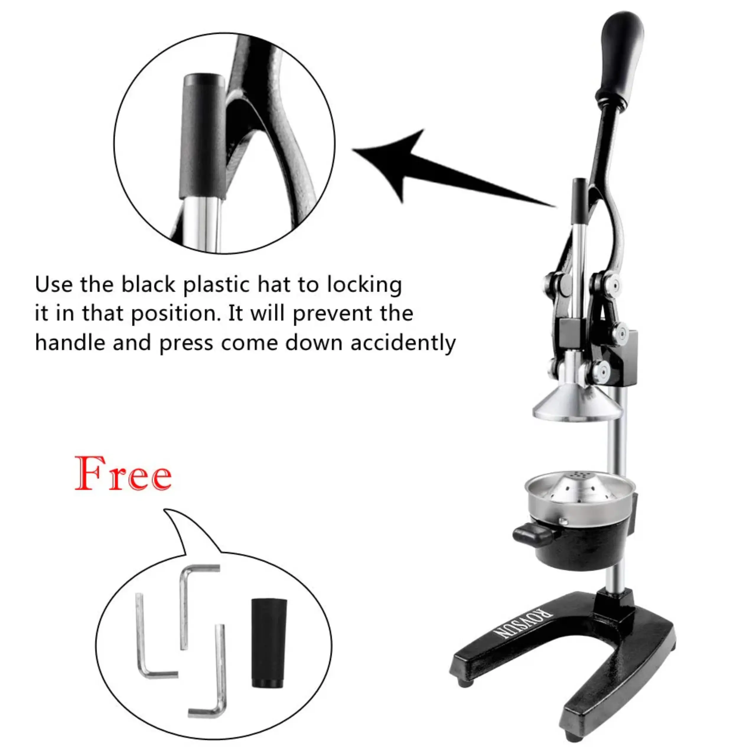 1. Free Safety Hat: Only ROVSUN can send you the safety hat. Use the black plastic hat to lock it in that position. It will prevent the handle come down accidently. This heavy duty orange juice squeezer have long and light handle with comfortable rubber grip which stop and reduce pressure on the hand.