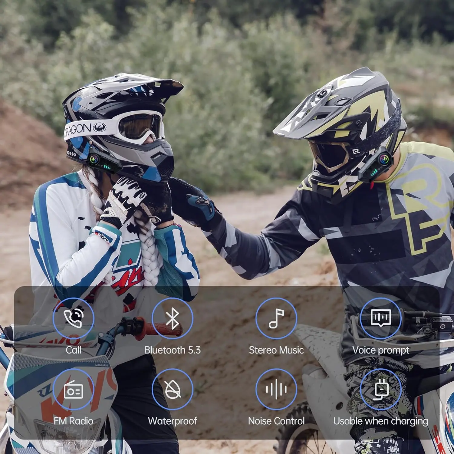 [Multi-functional Motorcycle Helmet Bluetooth Headset] Motorcycle headset adopts Bluetooth 5.3 technology, which effectively reduces disconnection and noise.Support intelligent noise cancellation and voice assistant,also simultaneously connect two smartphones and meet different needs such as navigation/calling/listening to music at the same time.