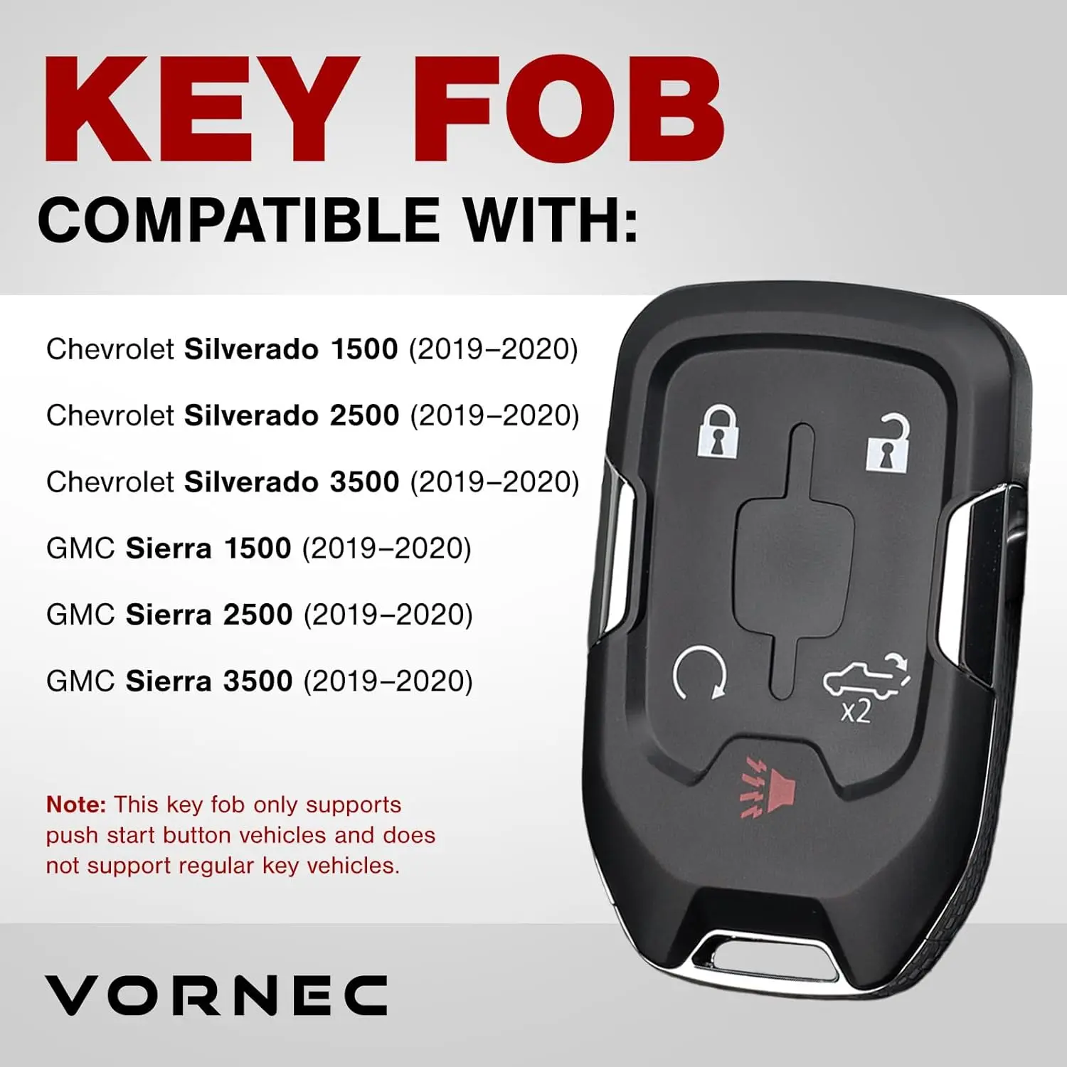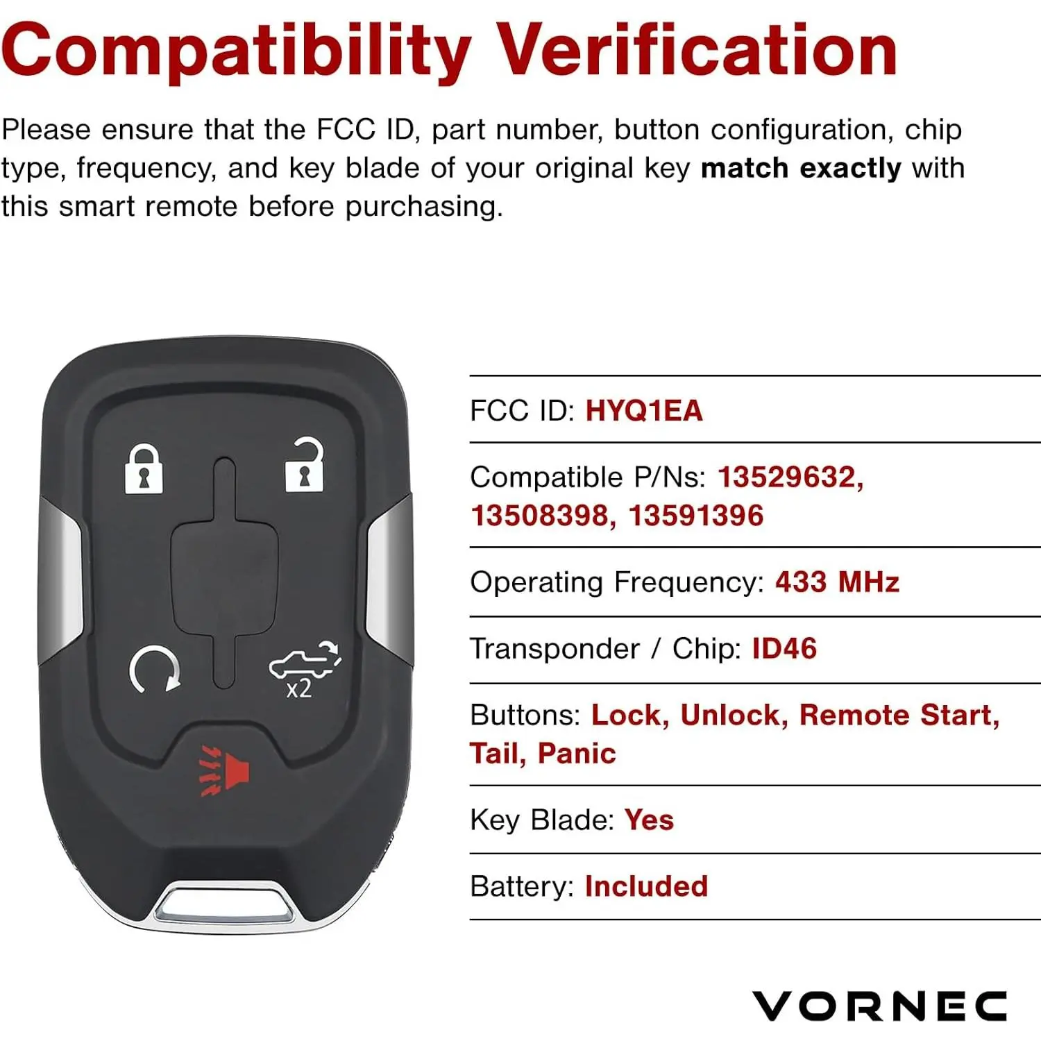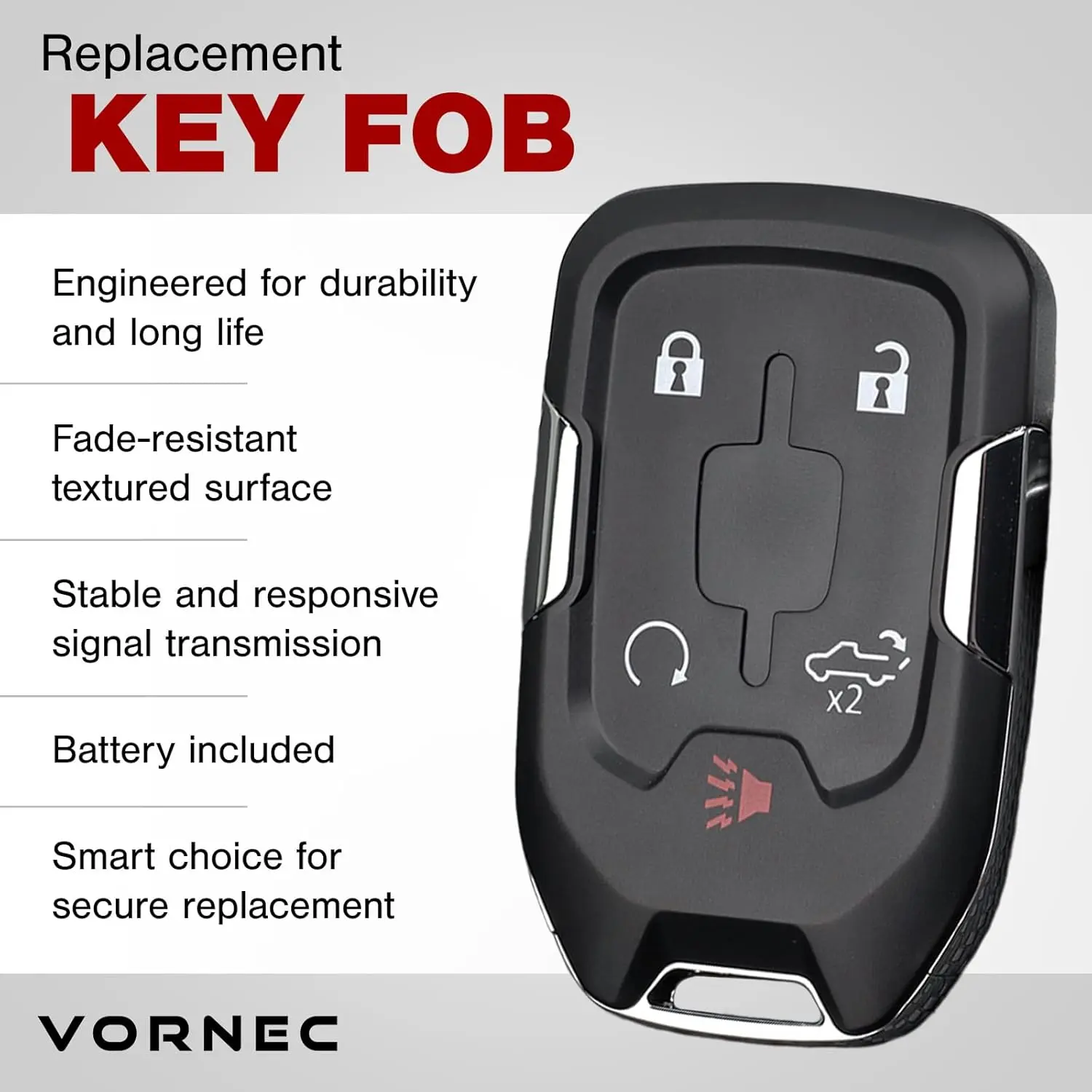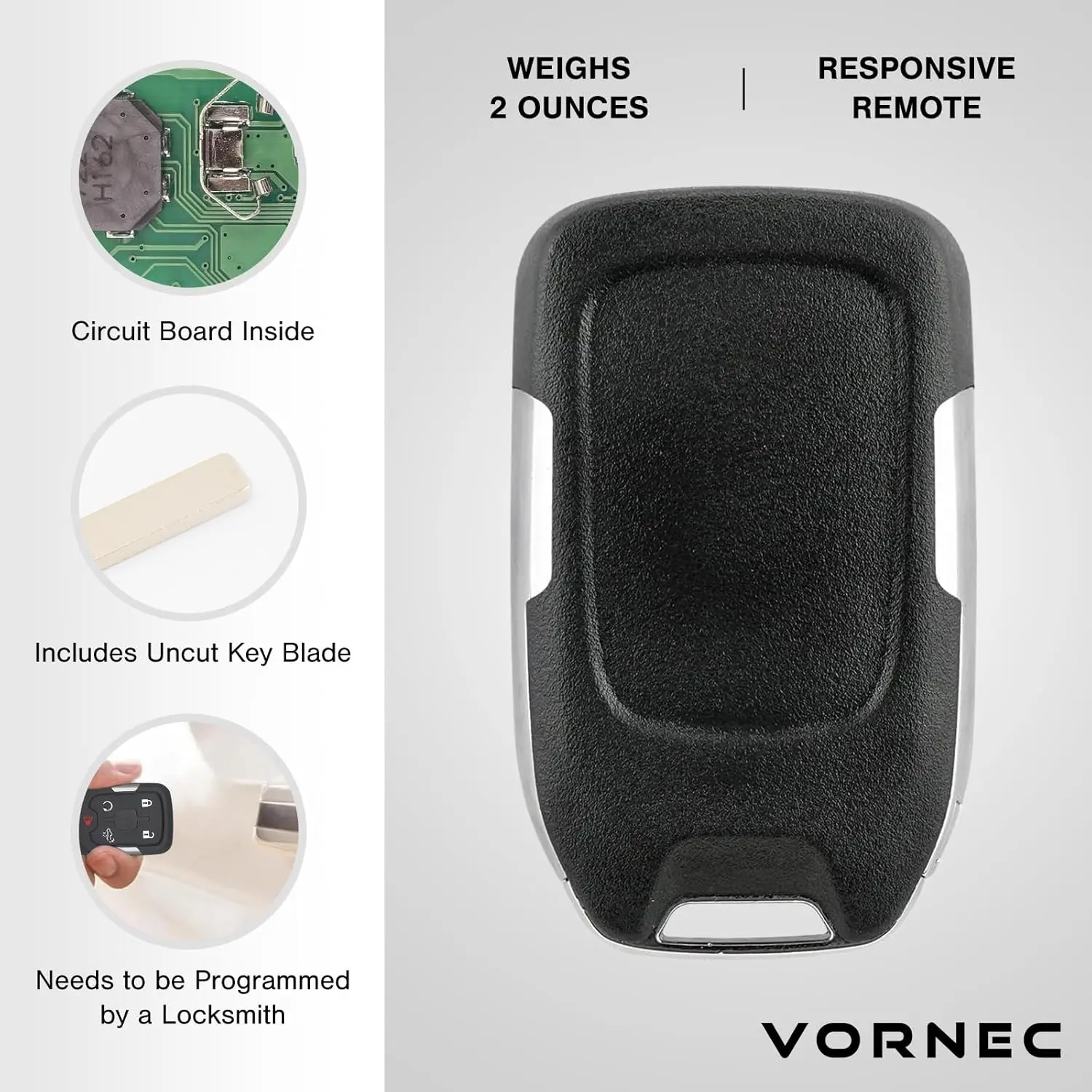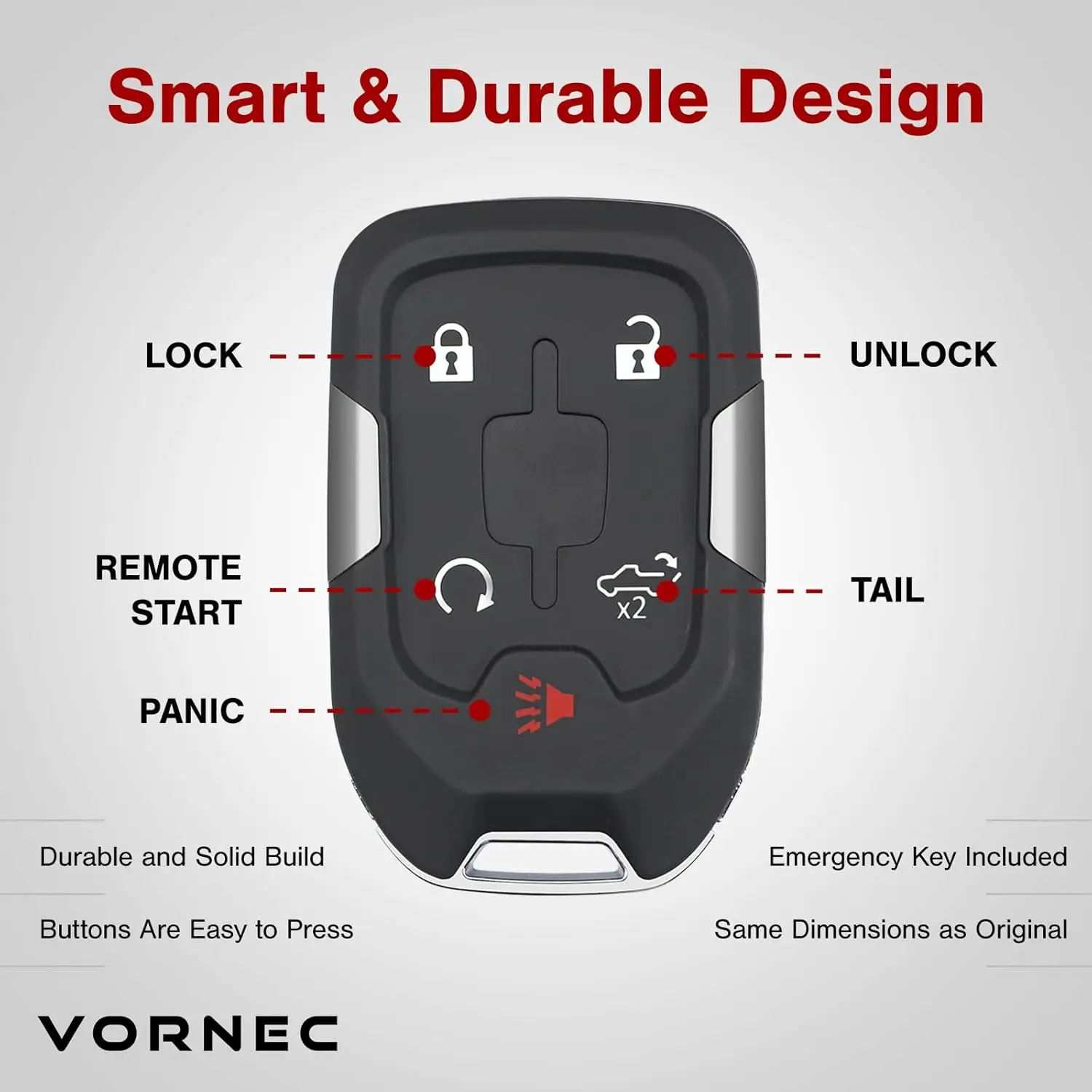 TheVornec Replacement Key Fob for Chevy and GMCis a dependable solution for replacing a lost, broken, or damaged remote. Designed to match OEM specifications, this5-button smart keyless entry remoteprovides the same functions as the original:lock,unlock,remote start,tail release, andpanic alarm. It also includes ablank uncut emergency bladethat must be cut to fit your vehicle.