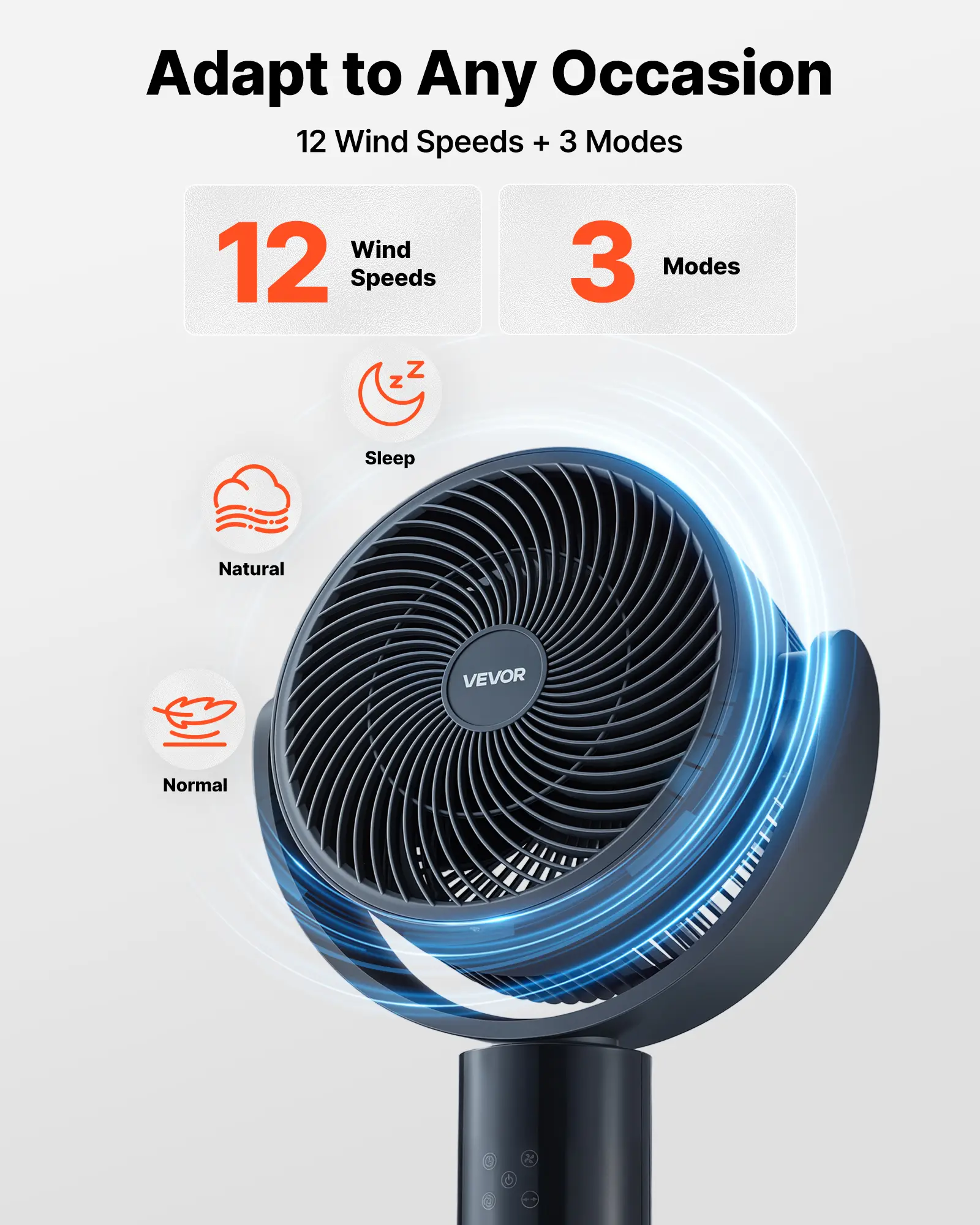 Custom Modes & Airflow Control: Our pedestal fan supports remote or panel control with 3 modes (normal/natural/sleep) and 12 speed levels to meet your needs. From a gentle breeze to powerful cooling, it allows effortless airflow adjustment