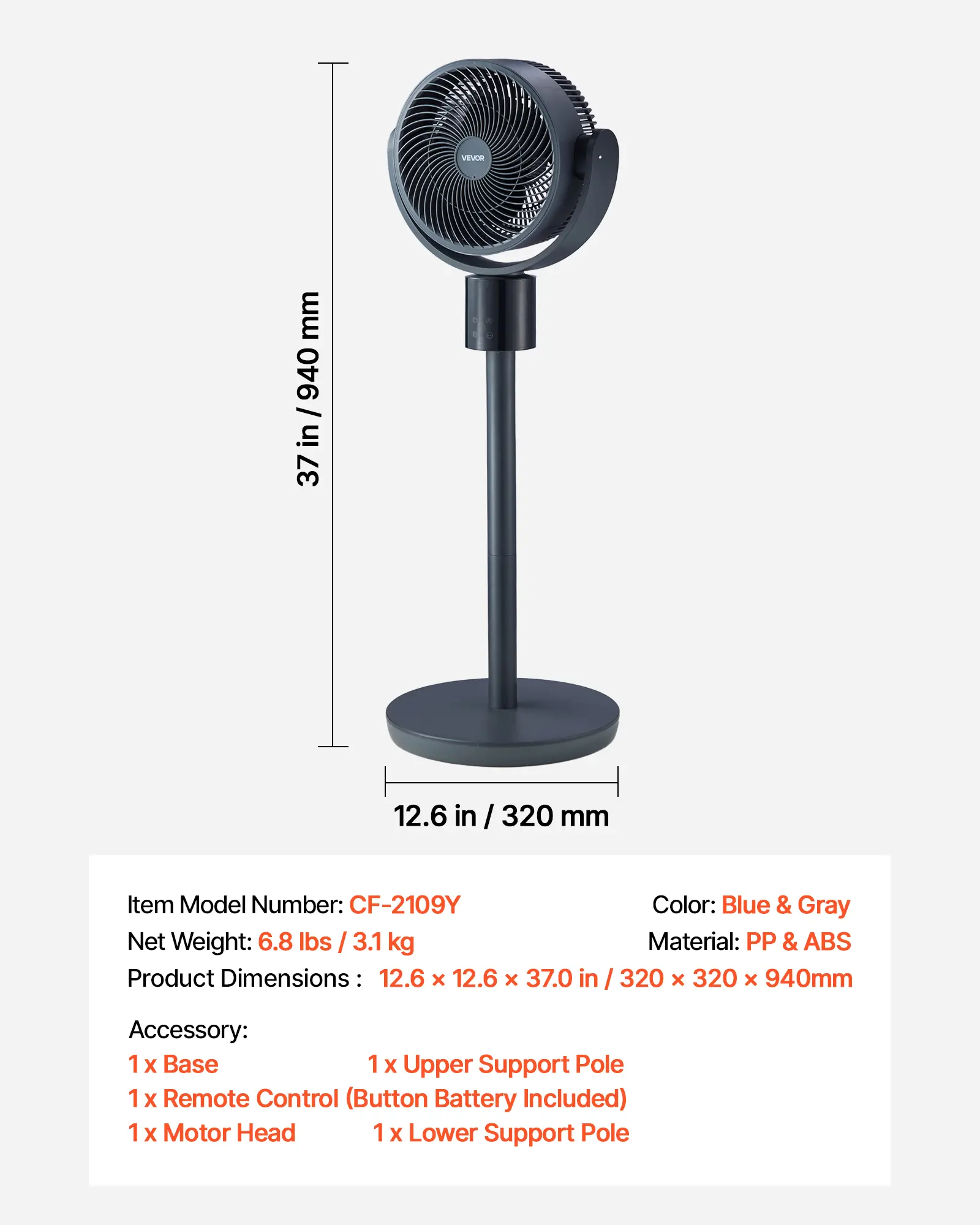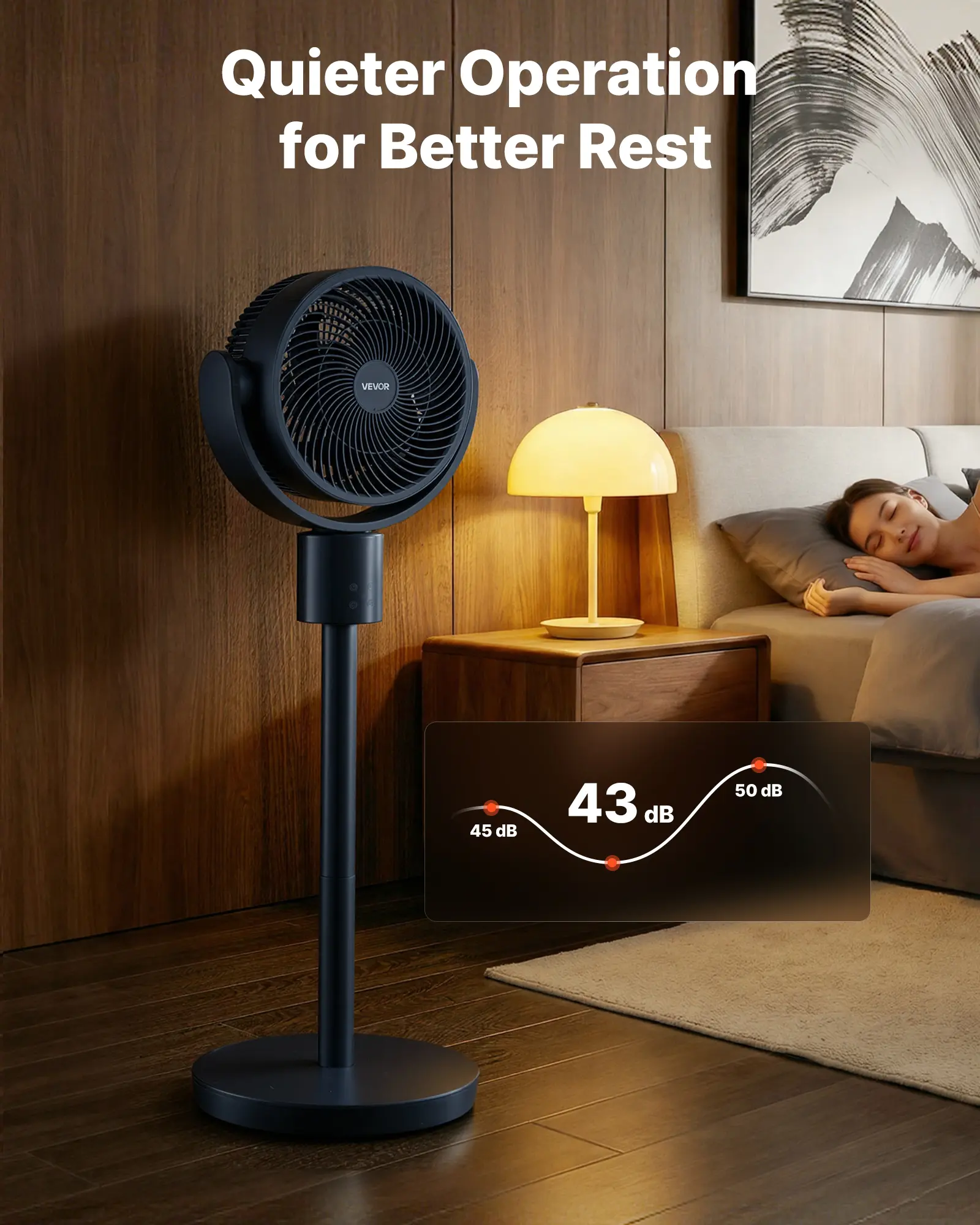 Powerful Motor: Equipped with a stable 20W high-performance motor, our standing fan delivers strong and steady airflow up to 570 CFM, with noise levels as low as 43 dB for quiet operation