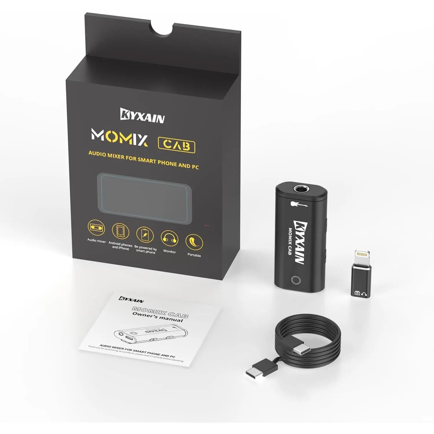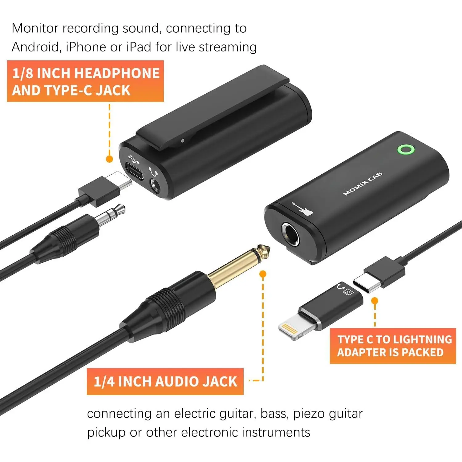 Excellent Compatibility: Type-C USB for Android smartphone or laptop.Comes with lightning to Type-C adapter for iPad iPhone.The 1/4" 6.35mm jack to connect electric guitar bass and the 1/8" 3.5mm headphone output supports monitoring