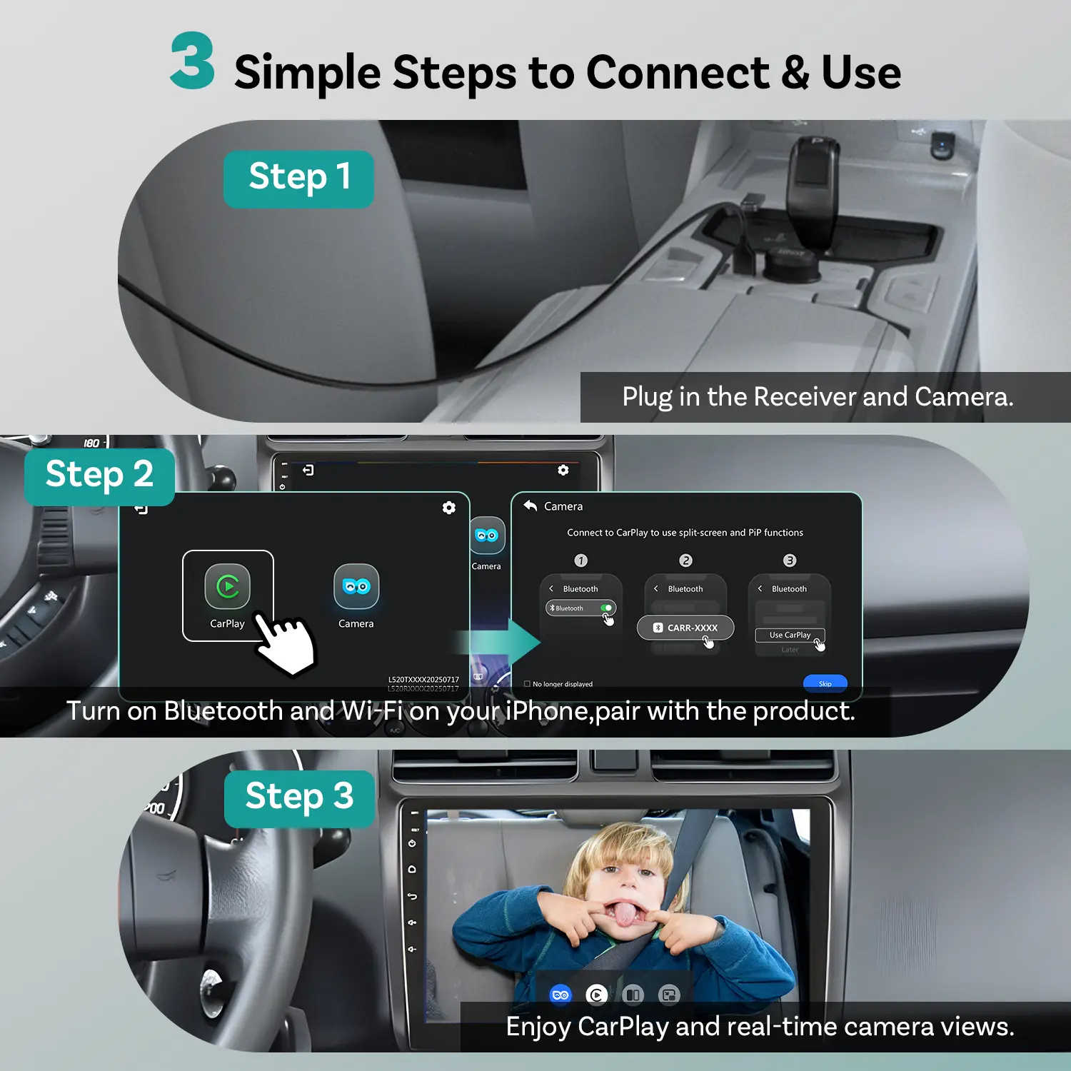 ·【Split-Screen Mode — Navigation and Baby View Side by Side】The Ottocast wireless CarPlay adapter solves a long-standing industry challenge by seamlessly integrating navigation and your baby camera feed on one screen. No more switching between views — stay focused on the road without missing any critical turns or directions. For added convenience, an extra-long 3m camera power cable is included, giving you the flexibility to install the camera anywhere in your car.