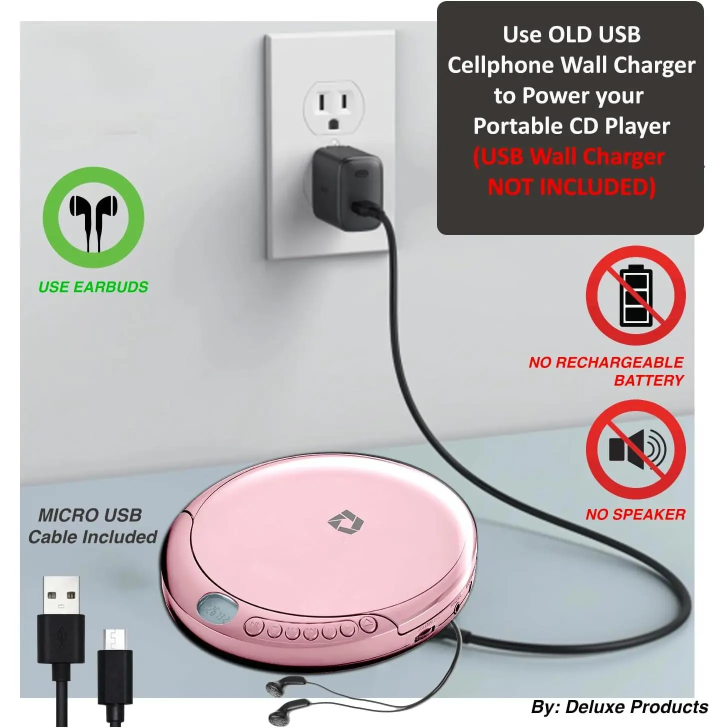 Long Battery Life - The discman CD player Uses 2 x AA Batteries (Batteries not included) – or You can power your portable cd players using the INCLUDED AC USB Cable (Smartphone USB wall adapter – NOT INCLUDED)