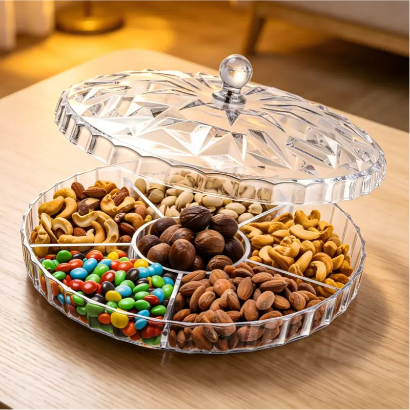 6 Compartments: This round plastic food storage organizer has 6 large compartments that fit well in limited space, providing enough room for various favorite snacks without mixing.