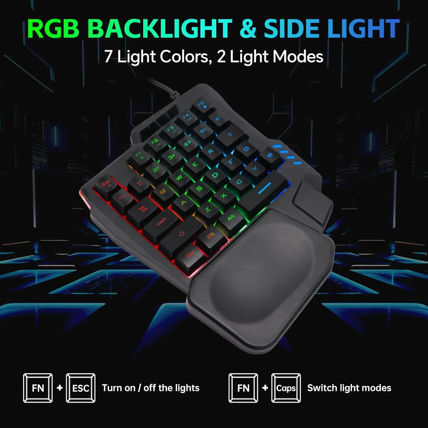 Small one hand keyboard & RGB Backlight---This gaming rgb backlit keyboard has half size of normal keyboard,is easy to carry on and save space to promise the mouse moving and using comfortable.Wide wirist-rest will reduce the fatigue effectively after long-term gaming.The RGB backlit supports breath mode and static mode, the cool lighting effect will bring you more fun for game (FN+ESC: backlight on/off, FN+Caps: Static/breathing mode)