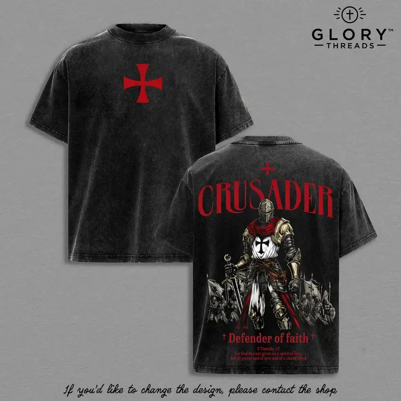 Crusader Defender of Faith Vintage Washed Oversized T-Shirt, 2 Timothy 1:7 Scripture Knight Graphic Tee, Heavy Cotton Medieval Christian Streetwear Top, Unisex Dark Gothic Warrior Shirt