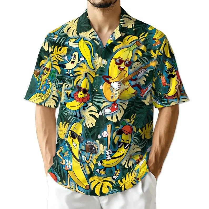 Aloha Banana Guitar Hawaiian Shirt, Funny Banana Music Aloha Shirt, Cartoon Fruit Button Down, Summer Beach Party Outfit Gift, S-5XL