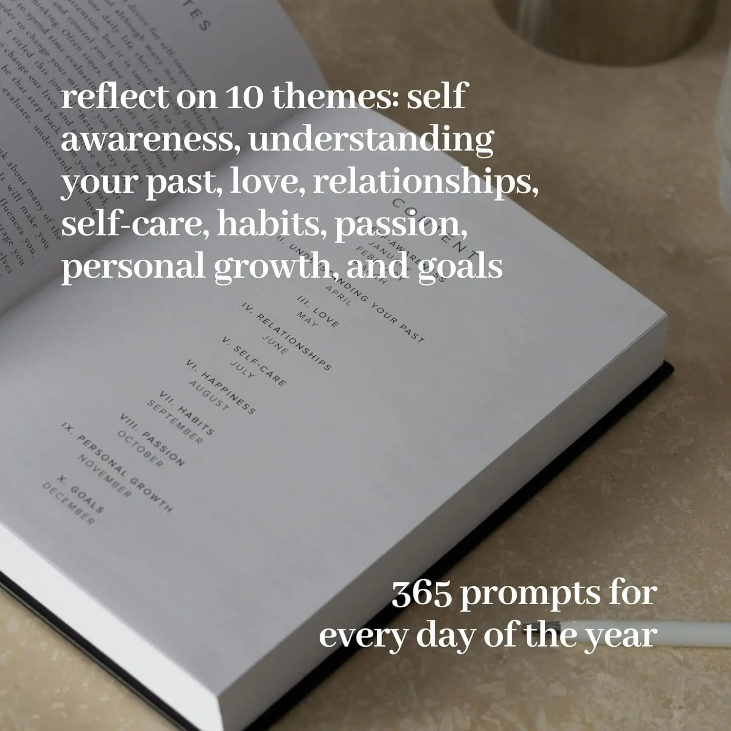 ·10 Core Journaling ThemesCovers self-awareness, past reflection, love, relationships, self-care, happiness, passion, growth, and goals. Leaves you feeling clear and aligned.