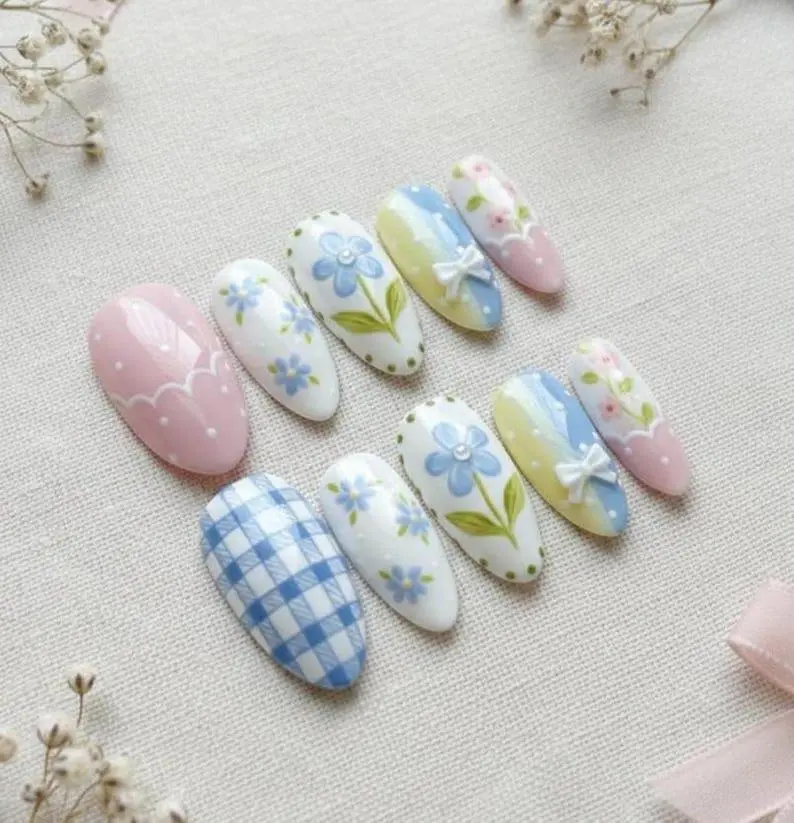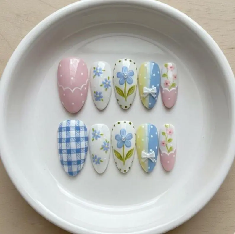 4. Coquette Gingham Floral Press on Nails, 3D Bow Daisy Glue Nails