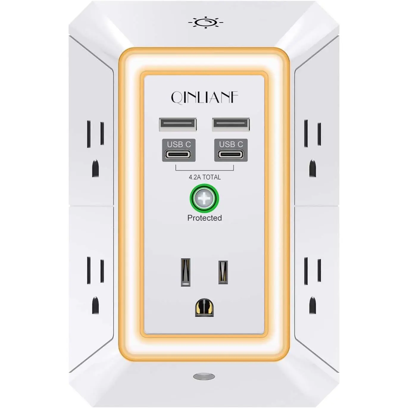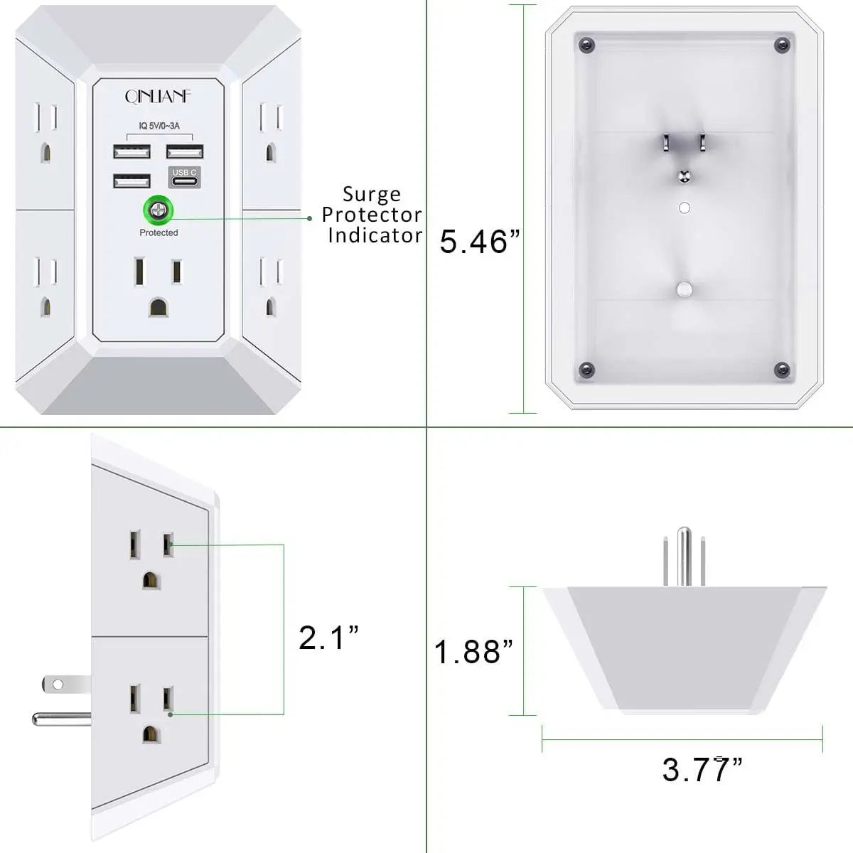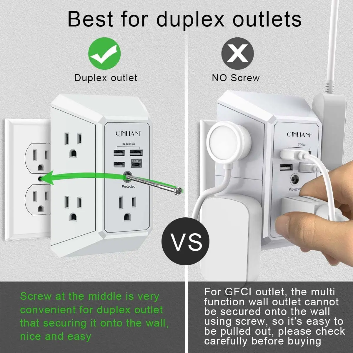 [ Multi Function USB Outlet]- Securing onto the wall design.Fit duplex outlet perfectly, just plug in to use.You get 5 AC outlet splitter (3 sides) with wide space in between