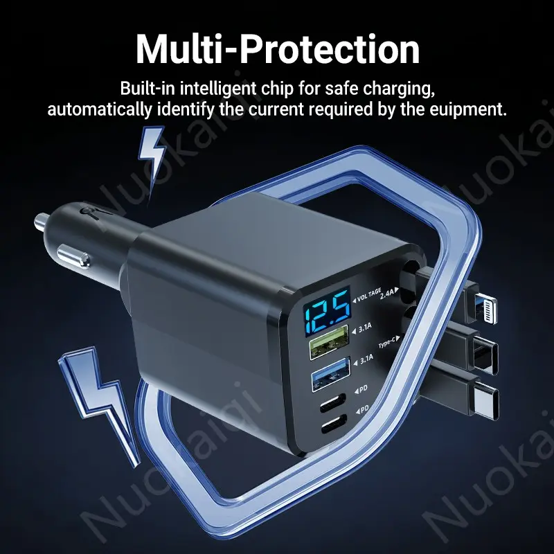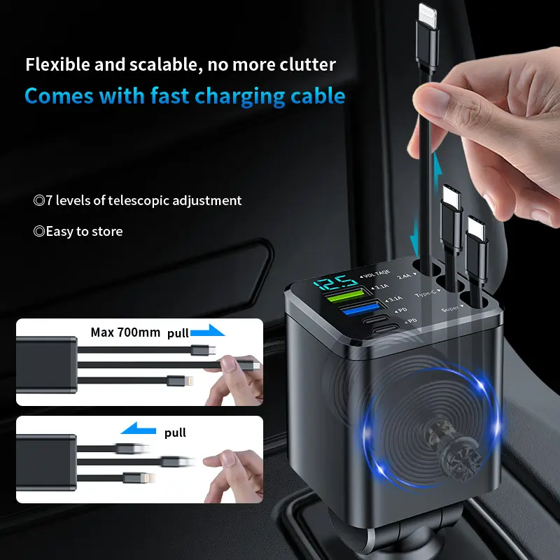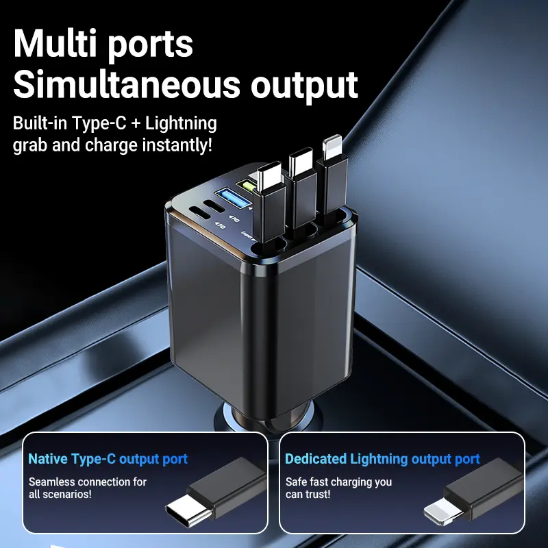 7-in-1 Car Charger — Retractable 3-in-1 Cable (Lightning + Built-in Type-C), PD 66W Fast Charging, and USB Port; Features Smart Chip Protection and Digital Voltage Monitoring; Widely Compatible with iPhone, Samsung, and Huawei Devices.