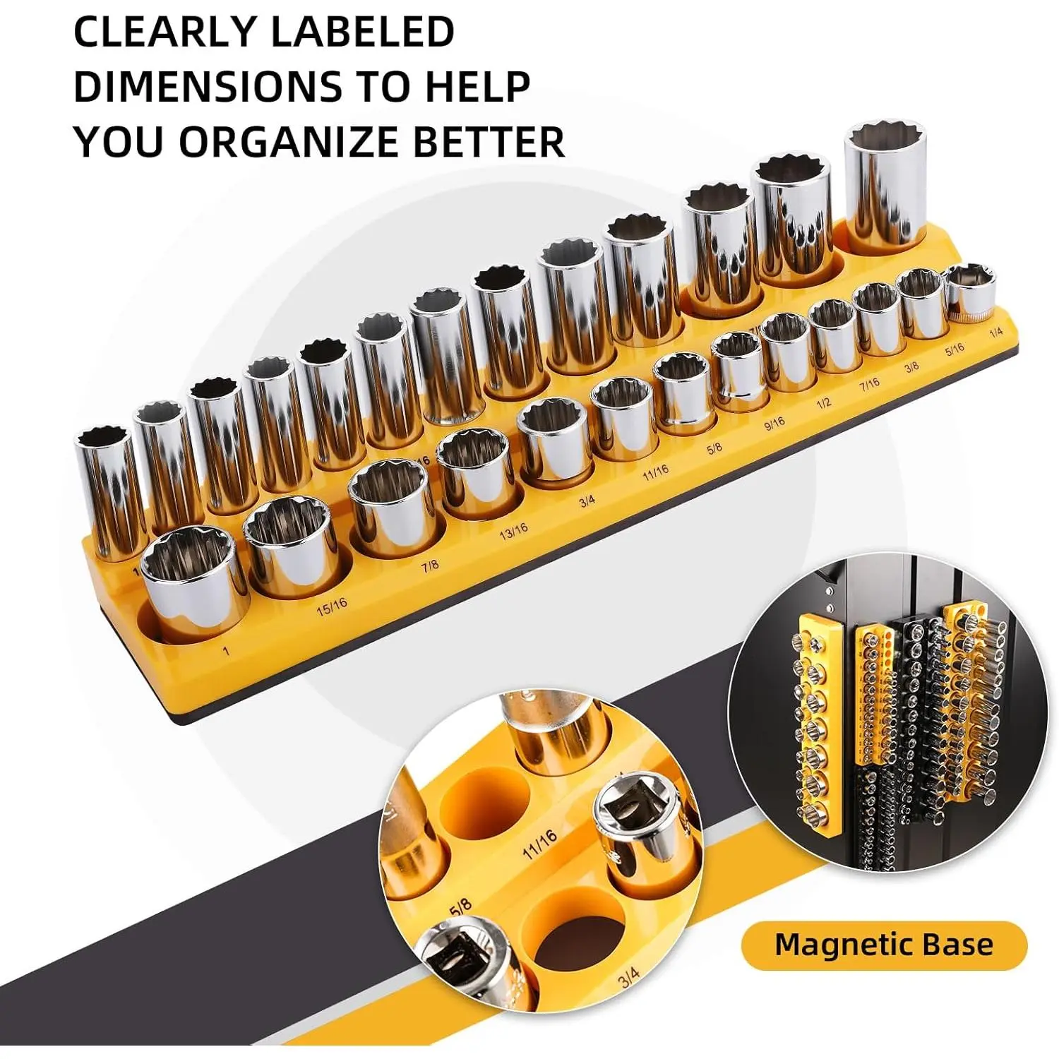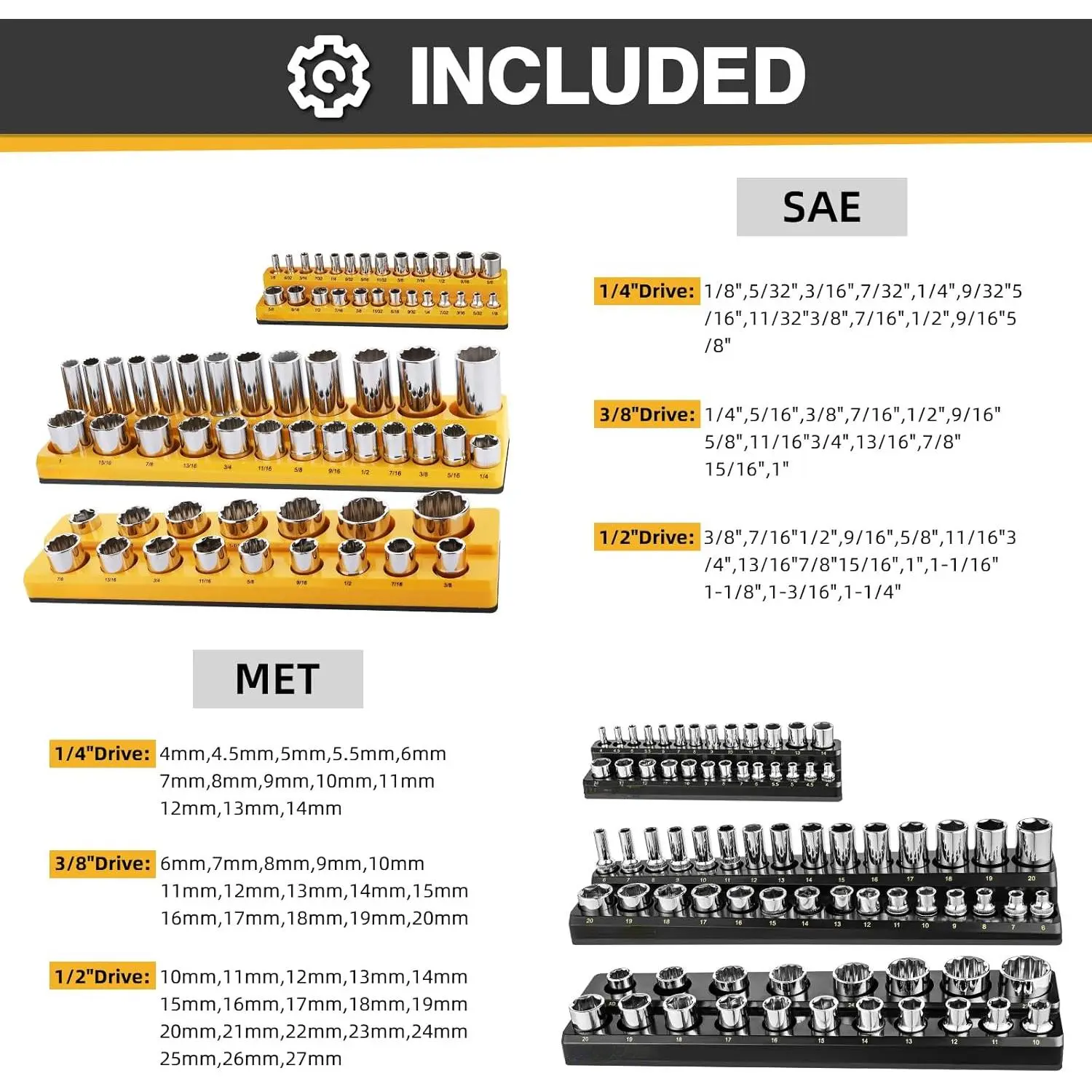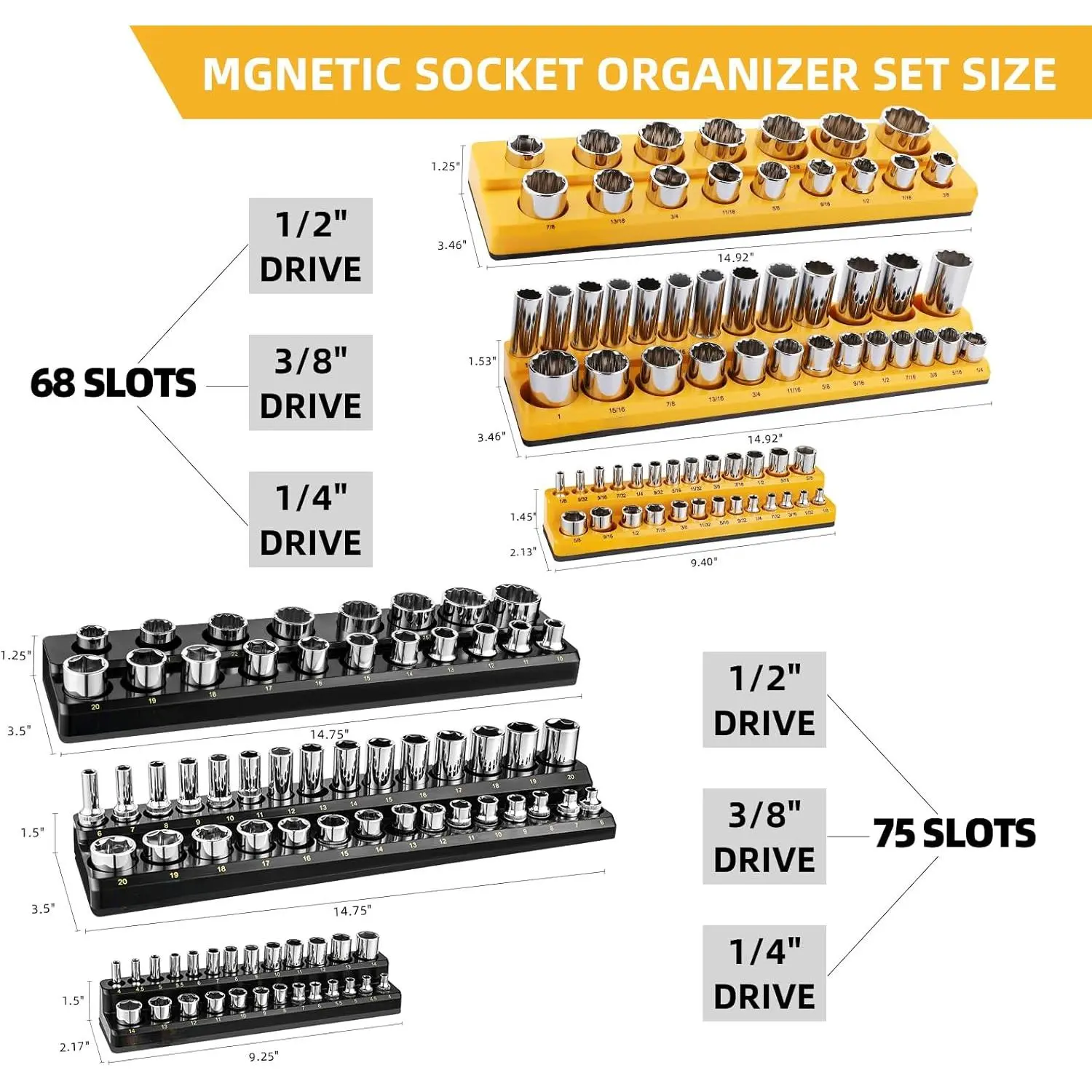 [Magnetic Socket Organizer Set]: Magnetic kit includes 3 black (1/4",3/8",1/2") metric magnetic socket organizers and 3 yellow (1/4",3/8",1/2") SAE magnetic slot organizers.Socket organizer holds multiple sizes of receptacles, including metric and SAE sizes.Magnetic socket tray holds up to 143 metric and SAE receptacles.
