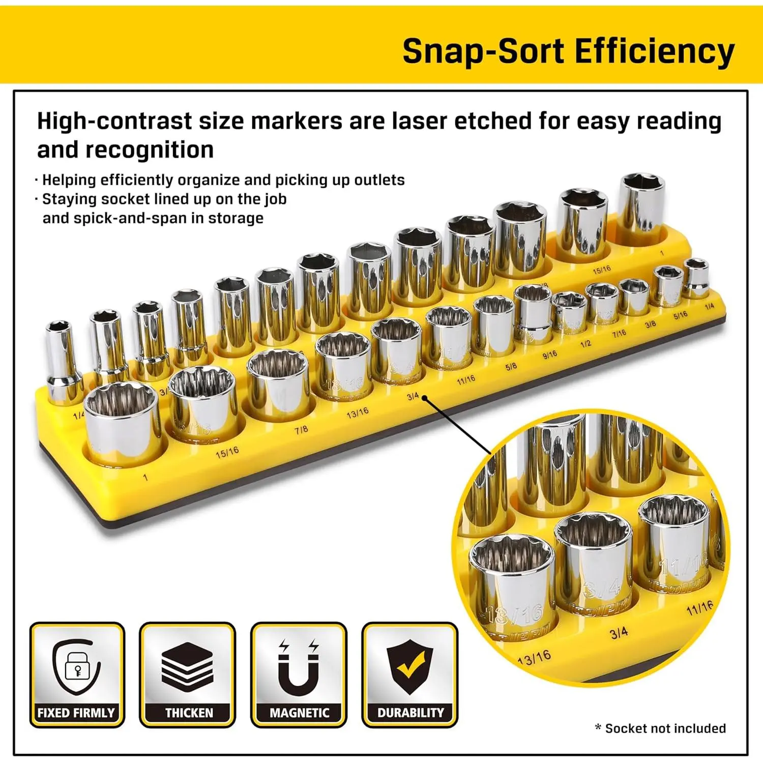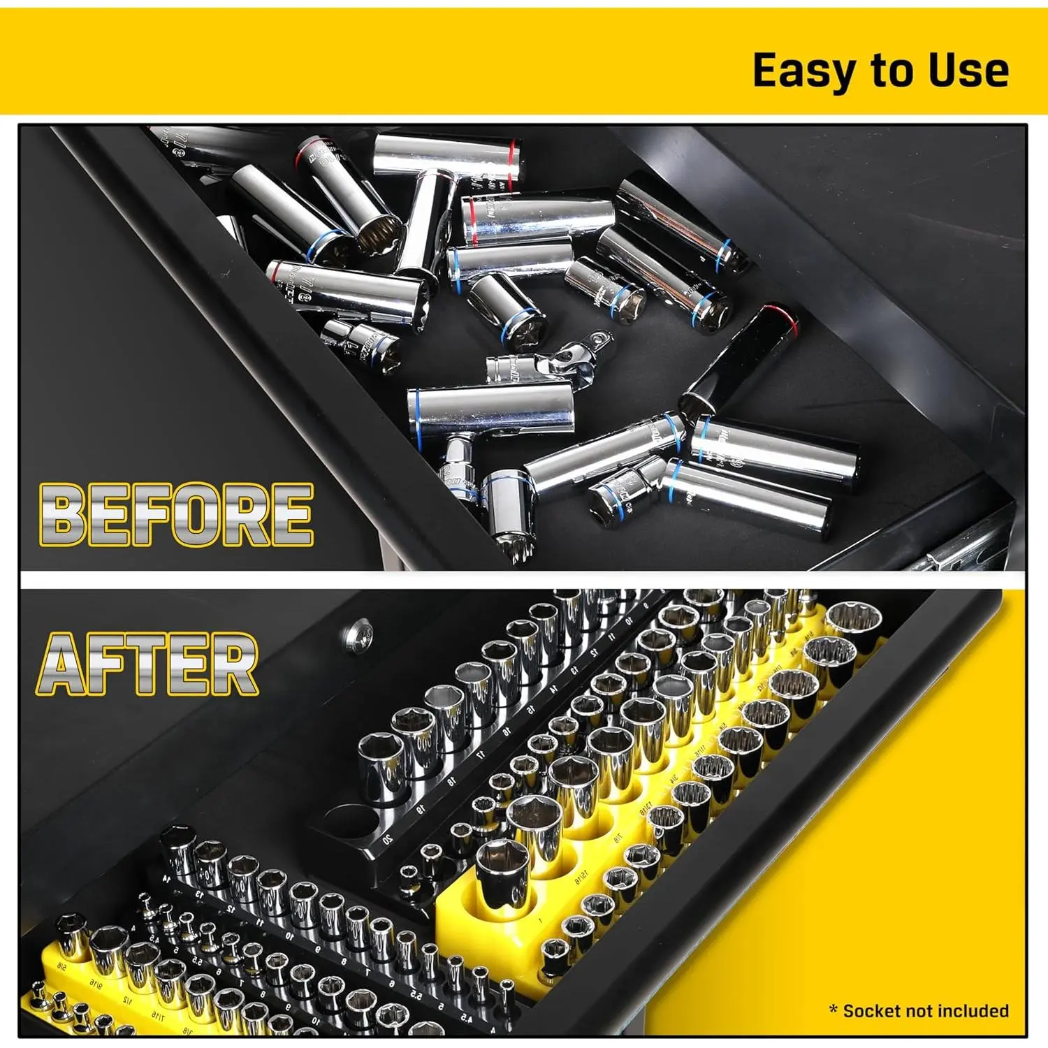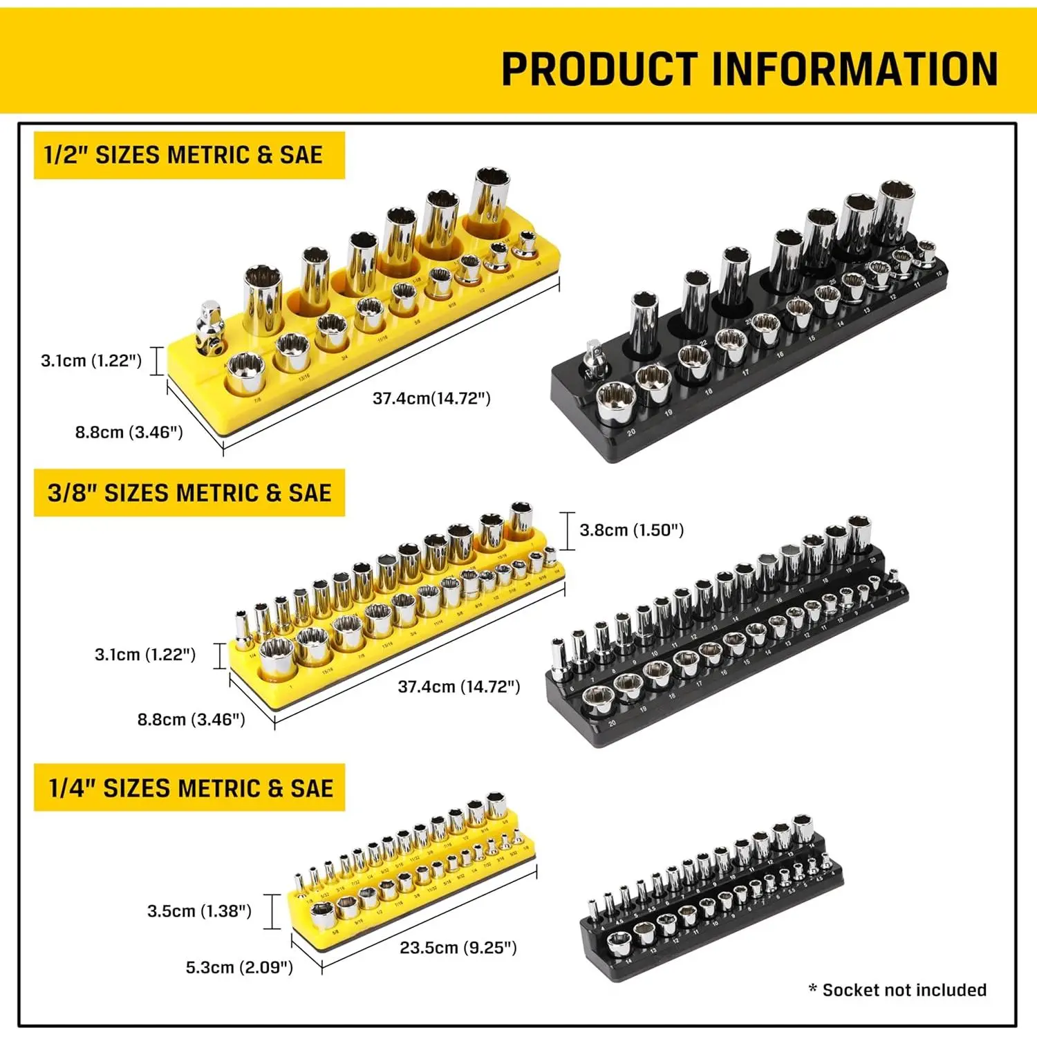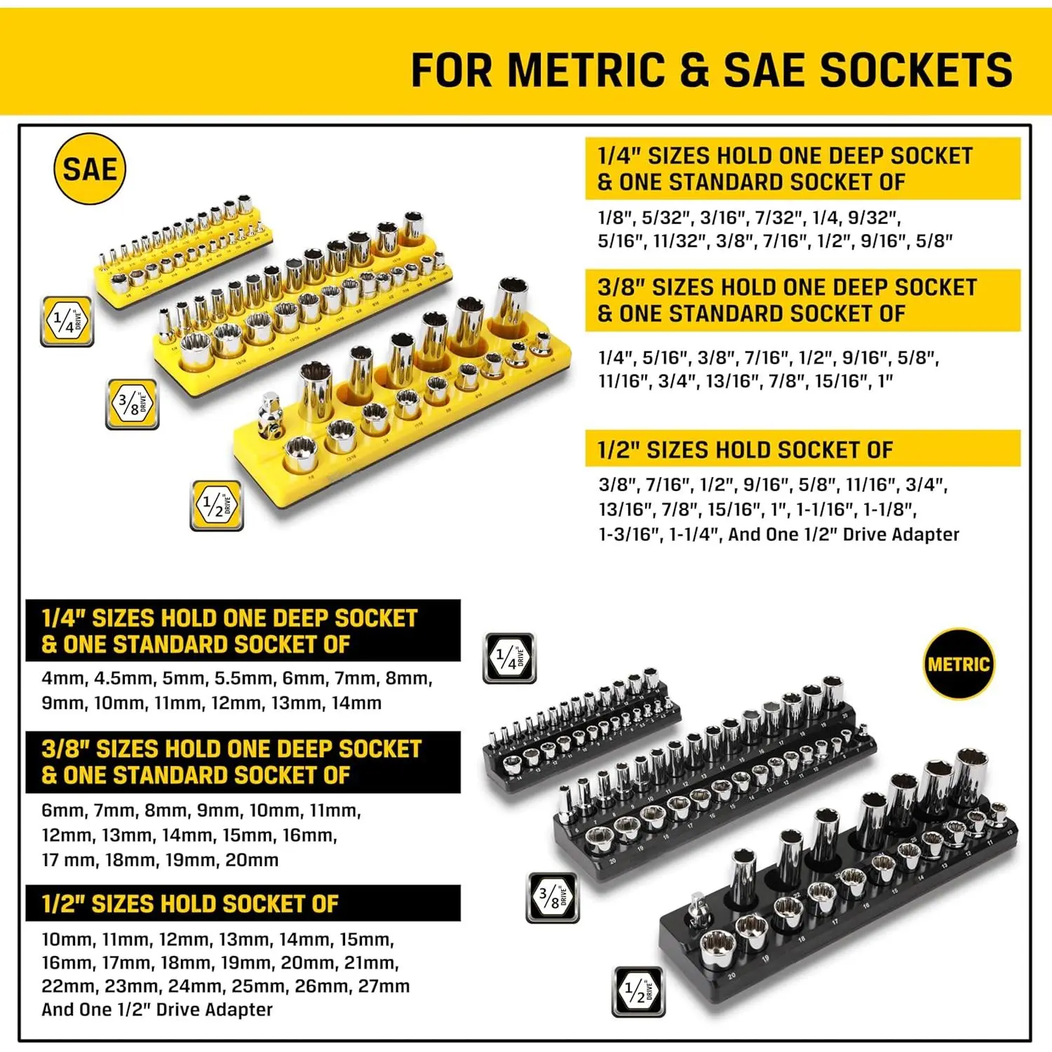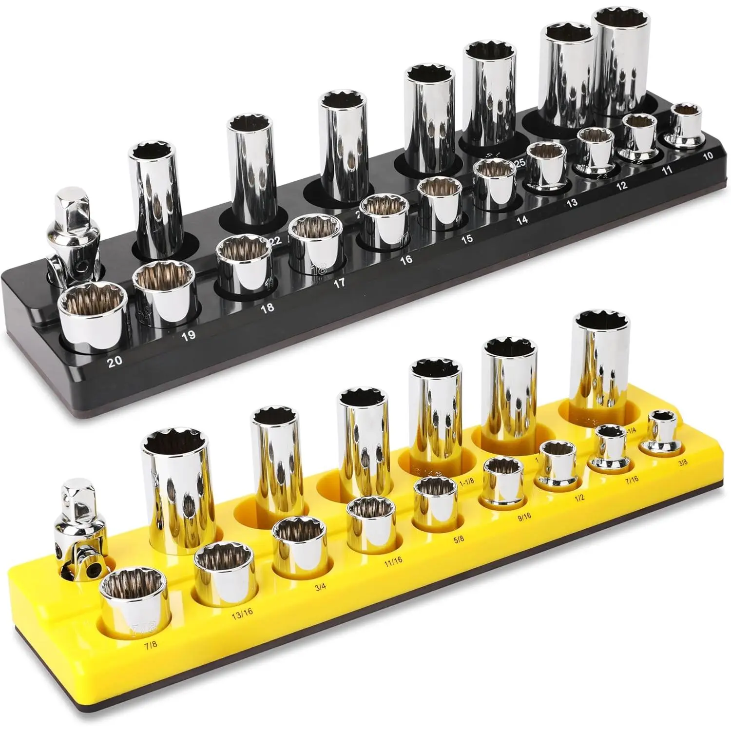 Large Capacity and Variety of Sizes: The 3-piece yellow SAE and 3-piece black metric socket holder kit can hold 141 parts of different sizes, containing 1/4 "3/8" 1/2 "multiple sizesHigh Quality Tools: The soft magnetic material enables the tool to have an adsorbable magnetic chassis while highly magnetically absorbing parts.The magnetic seat surface is made of ABS material, strong and durableEasy to Use: Magnetic Socket Organizer Set can better help you collect different types of parts, and can be suspended on the magnetic tool car or iron box, so that you can use more convenient during the operationWide Applications: It can be used for storing and organizing complex and large number of parts, and can be used in a wide range of scenarios such as automobile repair and item repairA Touching Practical Gift: It can be used as a holiday gift for loved ones, practical and surprising