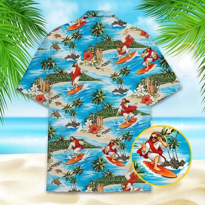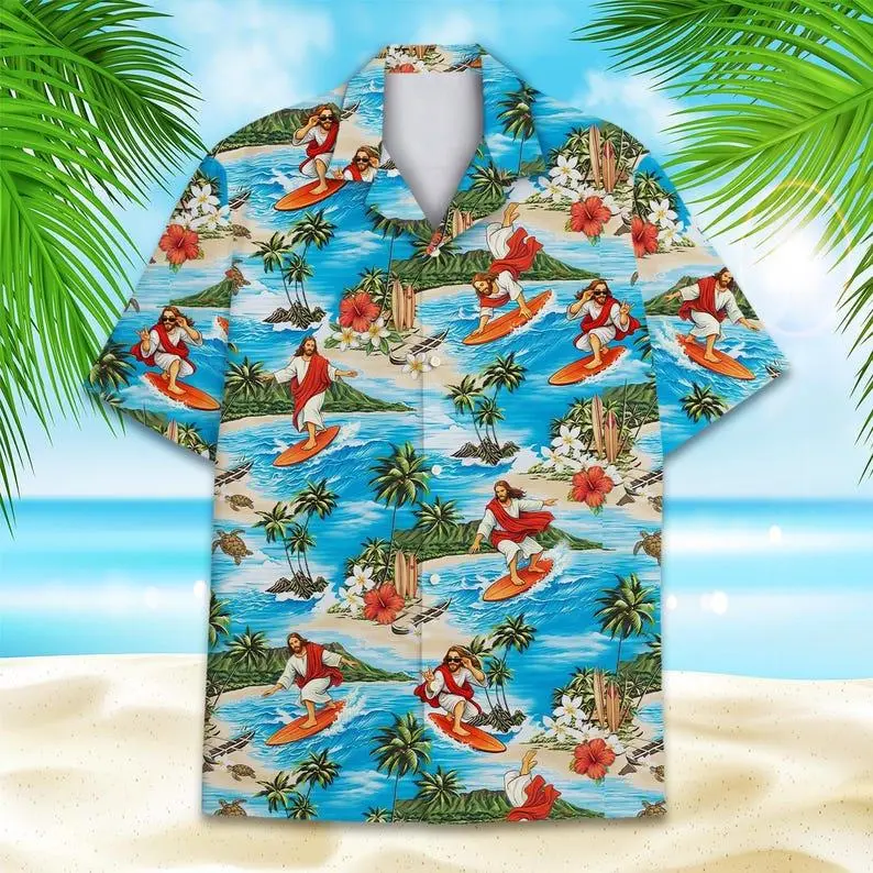 5. Jesus Surfing Hawaiian Shirt Men Women Youth, Funny Christian Beach Shirt, Summer Tropical Button Up, Religious Surf Aloha Shirt Gift