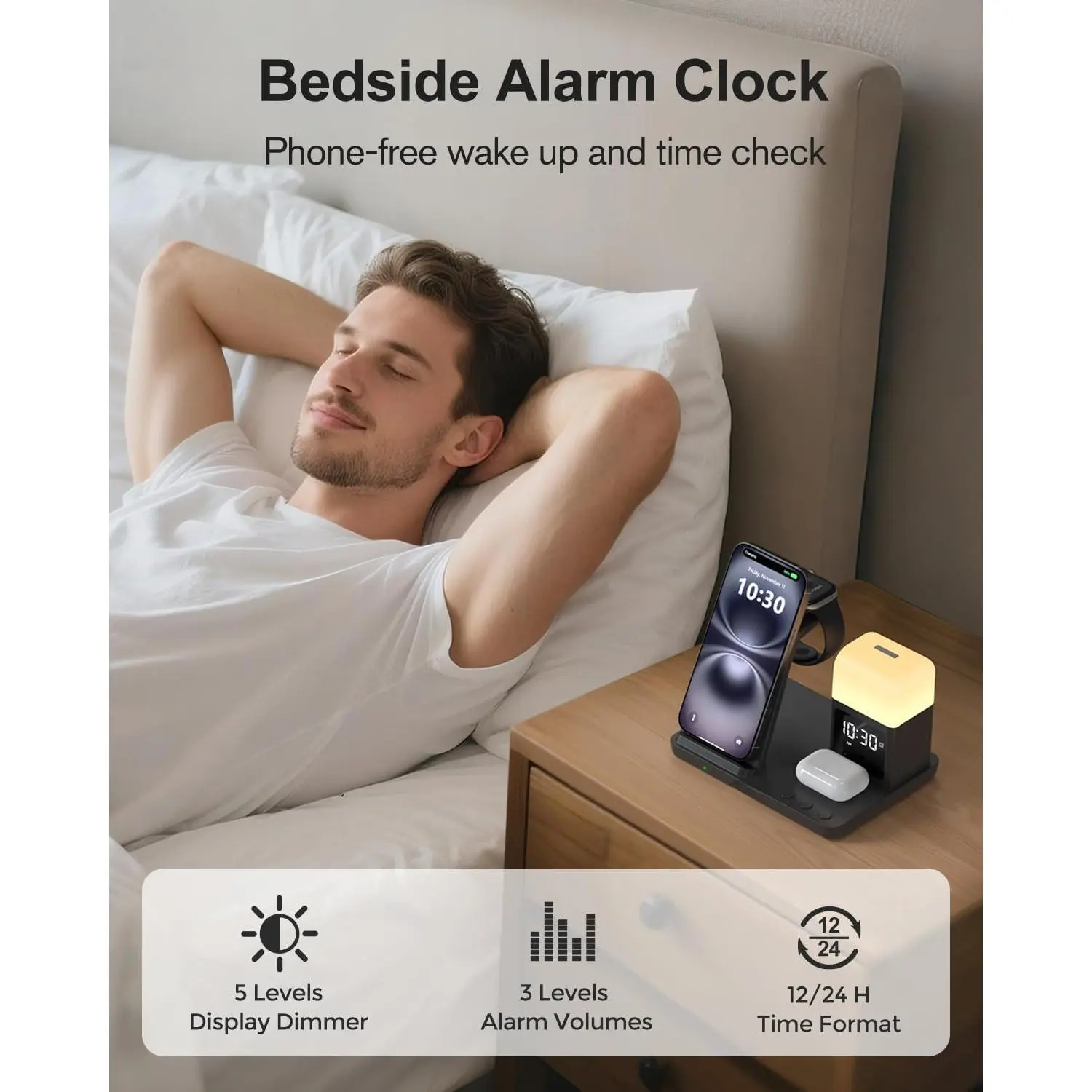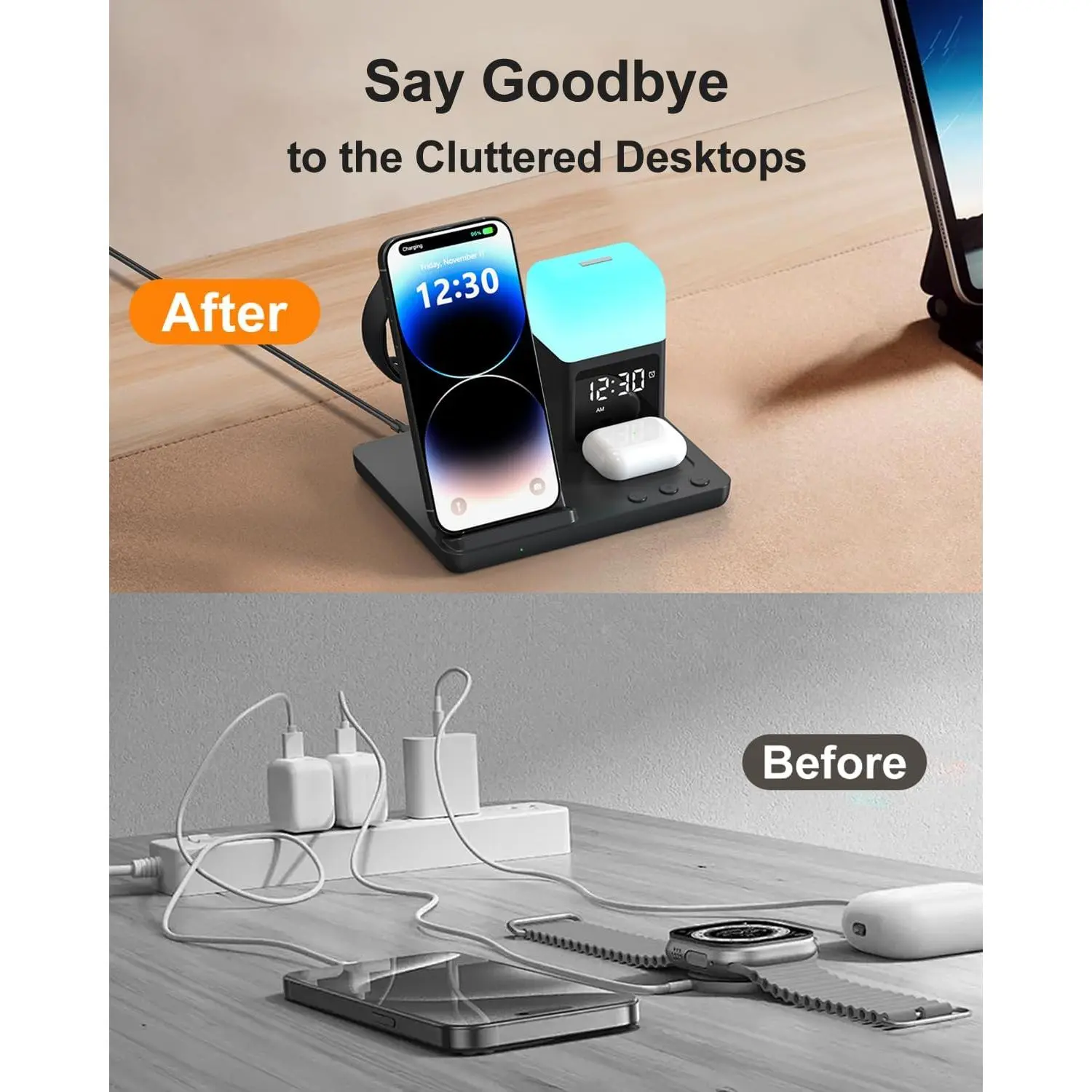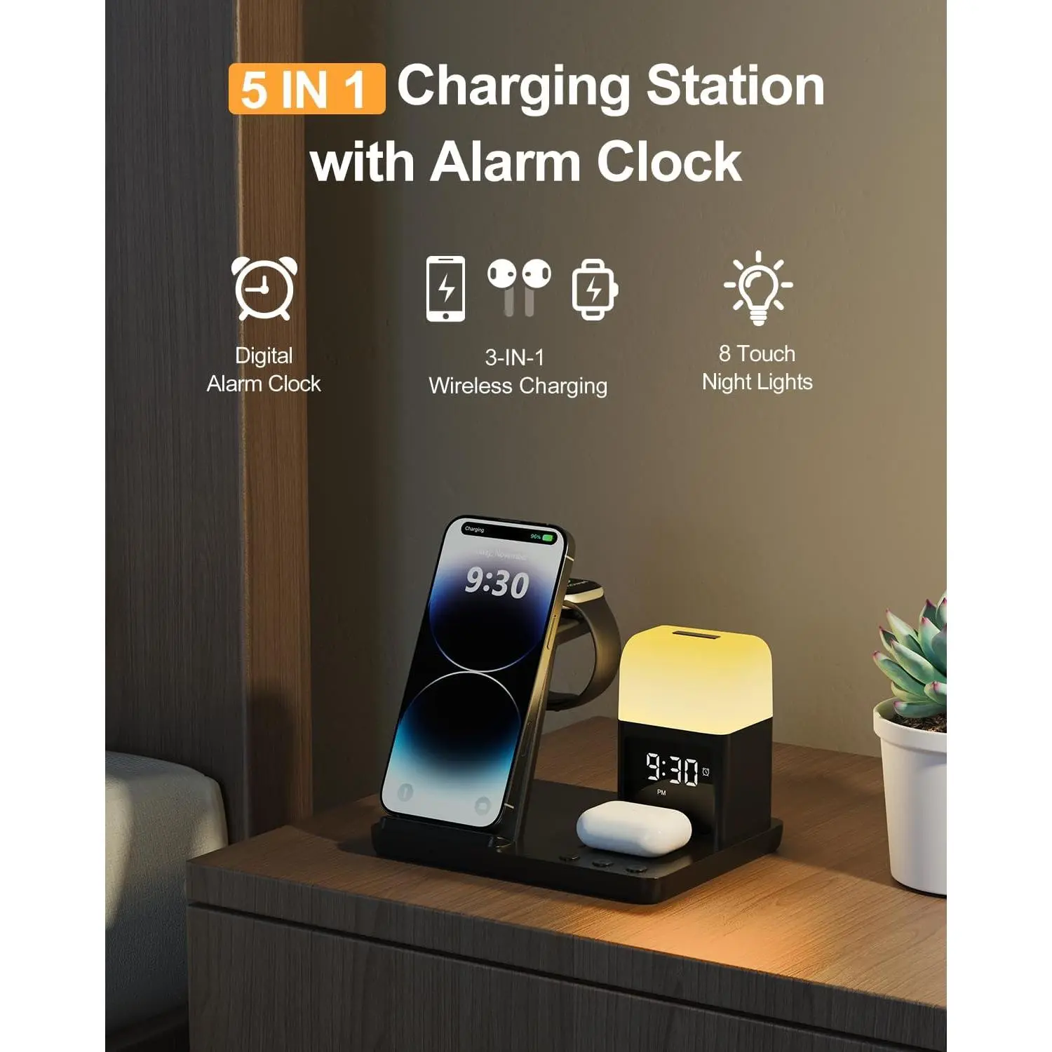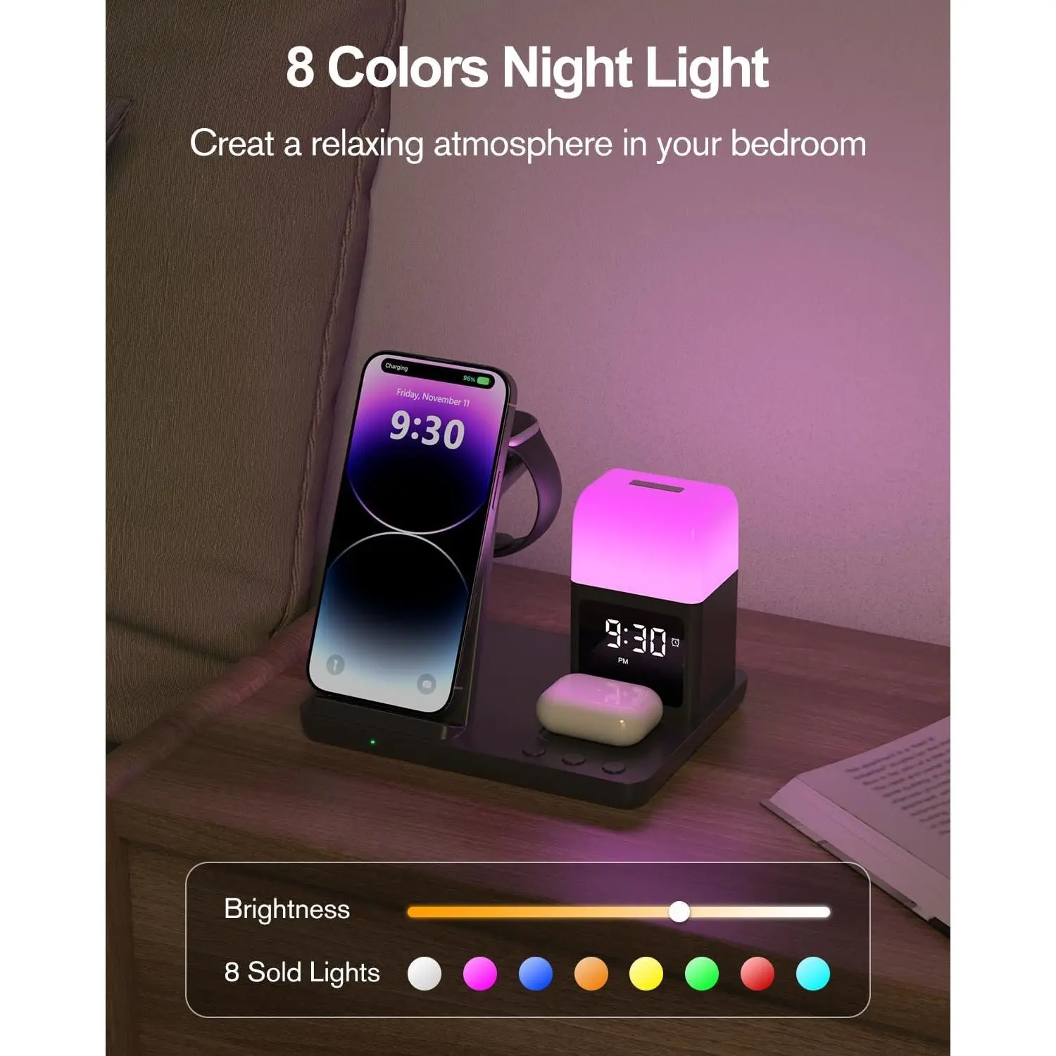 💙[5𝐢𝐧 𝟏 𝐖𝐢𝐫𝐞𝐥𝐞𝐬𝐬 𝐂𝐡𝐚𝐫𝐠𝐢𝐧𝐠 𝐒𝐭𝐚𝐭𝐢𝐨𝐧 𝐰𝐢𝐭𝐡 𝐀𝐥𝐚𝐫𝐦 𝐂𝐥𝐨𝐜𝐤 & 𝐍𝐢𝐠𝐡𝐭 𝐋𝐢𝐠𝐡𝐭]super cool wireless charging docking station, combines 3 in 1 wireless charging function for iphone/Apple watch/Airpods+alarm clock+8 different colors night light in one, Say goodbye to messy cables, make your nightstand more organized and create a relaxing sleeping environment with nightlight