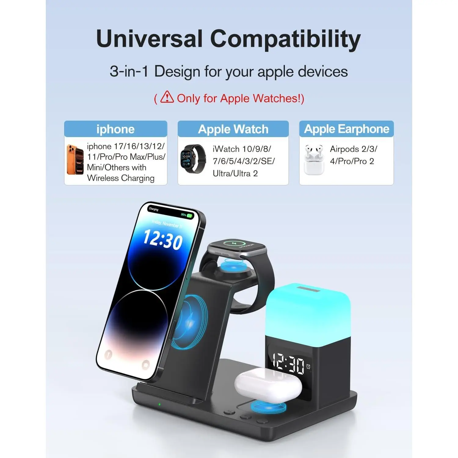💙[𝐖𝐢𝐝𝐞𝐥𝐲 𝐂𝐨𝐦𝐩𝐚𝐭𝐢𝐛𝐥𝐞 𝐰𝐢𝐭𝐡 𝐌𝐮𝐥𝐭𝐢𝐩𝐥𝐞 𝐃𝐞𝐯𝐢𝐜𝐞𝐬]This wireless charger is suitable for iphone 17 16 15 14 13 12 11 10 9 8 Pro/Pro Max/Plus/mini/air/X/XR/XS/XS series, sumsung and other Andord mobile phones with built-in wireless charging function, Apple Airpods Pro 3/Pro 2/Pro/4/3/2 with wireless charging function, Apple Watch 11/10/9/8/7/6/5/SE/SE 2/SE 3/Ultra/Ultra 2/Ultra 3.Not compatible with AirPods 4 (without Active Noise Cancellation)