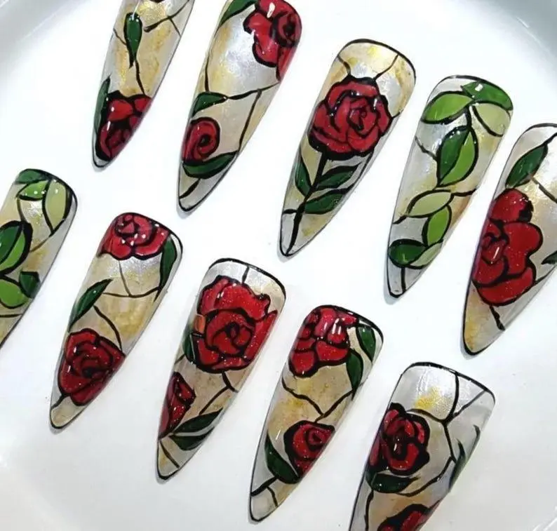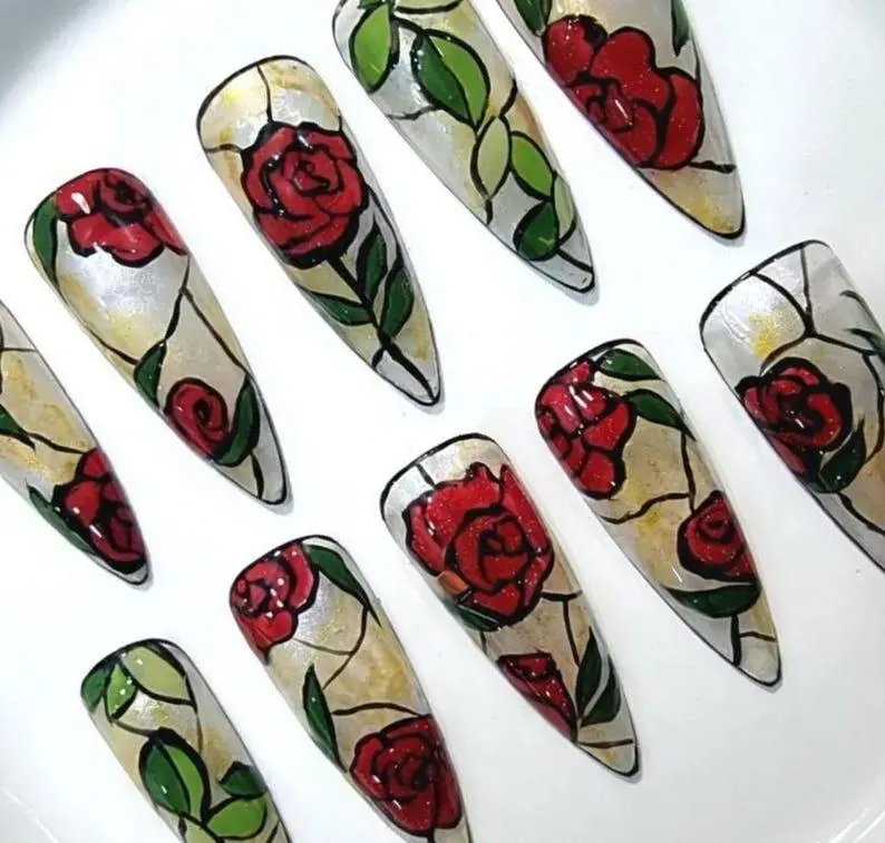 Hand-Painted Enchanted Rose Press on Nails, Gothic Leaf Red Stained Glass Floral Fingernails, Handmade Glossy Tips, Gift For Her on Birthday