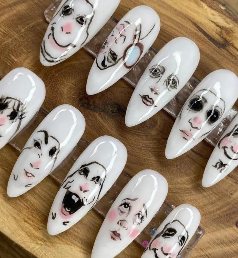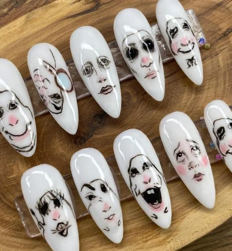Funny Meme Press On Nails, Creepy Face Design, Quirky Y2K Viral Cartoon Nail Art Set, Handmade Almond Manicure, Statement Tips For Girl