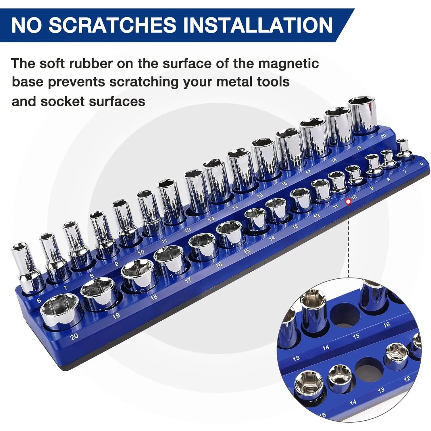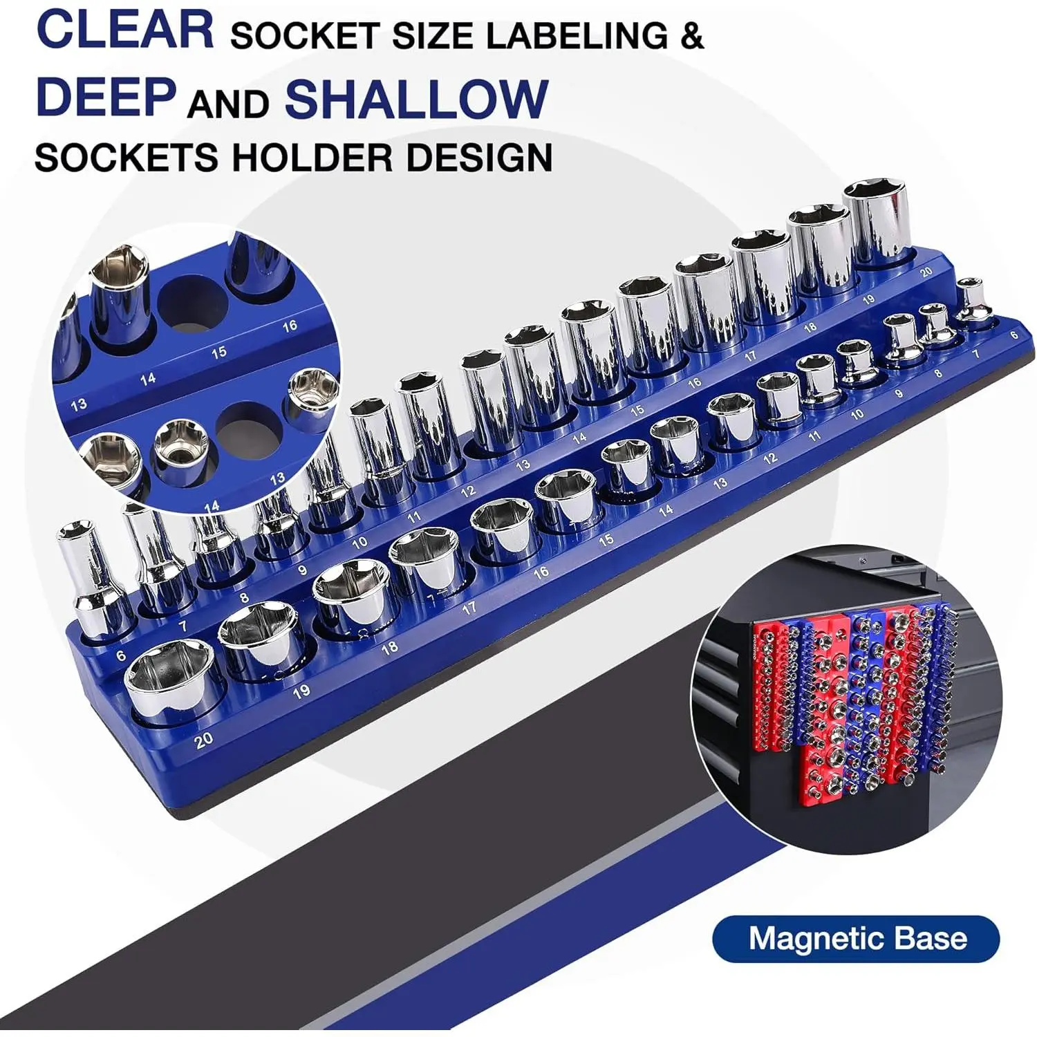 Large Capacity Magnetic Socket Organizer Set: These magnetic socket organizers can store up to 143 metric and SAE sockets.The kit includes three blue metric magnetic socket organizers and three red SAE magnetic socket organizers for 1/4", 3/8", and 1/2" drives.Used to hold SAE and metric receptacles, but not for impact sockets.Tip: Sockets are not included with the holdersMagnetic Base: The magnetic base secures the sockets in their designated places.They won't fall out even if you turn the socket tray upside down.It also allow you to attach the tray to any steel surfaceNo Scratches Installation: The surface of the magnetic base is composed of soft rubber, so there is no need to worry about scratching the surface of your metal tools and sockets.It's the perfect fit for your tool setKeep Your Sockets Organized: Find the right socket quickly and easily with this magnetic socket holder set.Each tray has a legible label, so you can identify the correct slot instead of searching through a disorganized toolbox.Tip: The socket organizer set is not suitable for storing impact sockets.Suitable for Standard and Deep Sockets: The 1/4", 3/8", and 1/2" drive magnetic socket organizers are designed for securely store of both deep and standard metric and SAE sockets, keeping your collection neatly organized. You can place them anywhere-such as in a drawer or mounted on the side of your toolbox, for easy access anytime