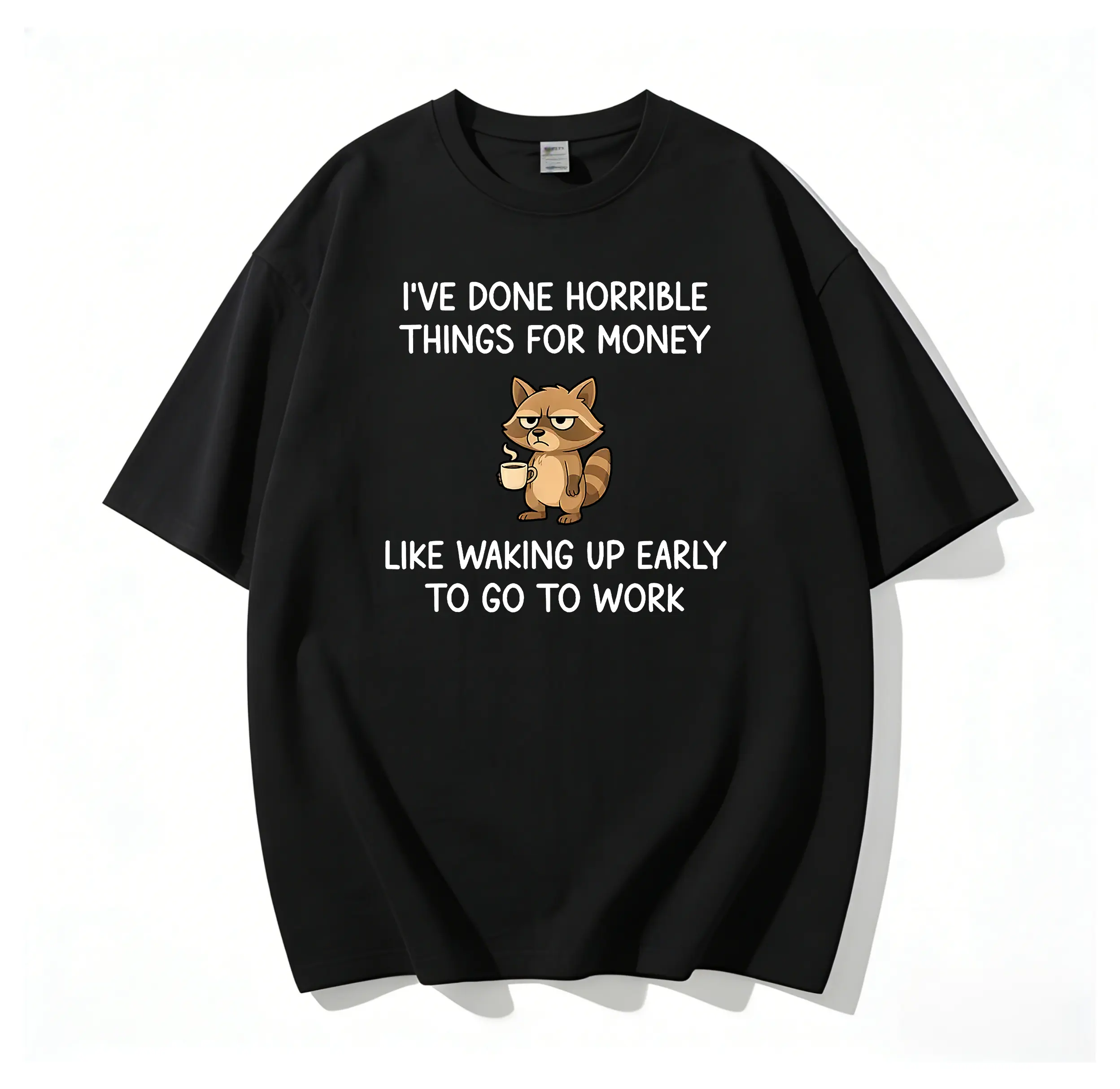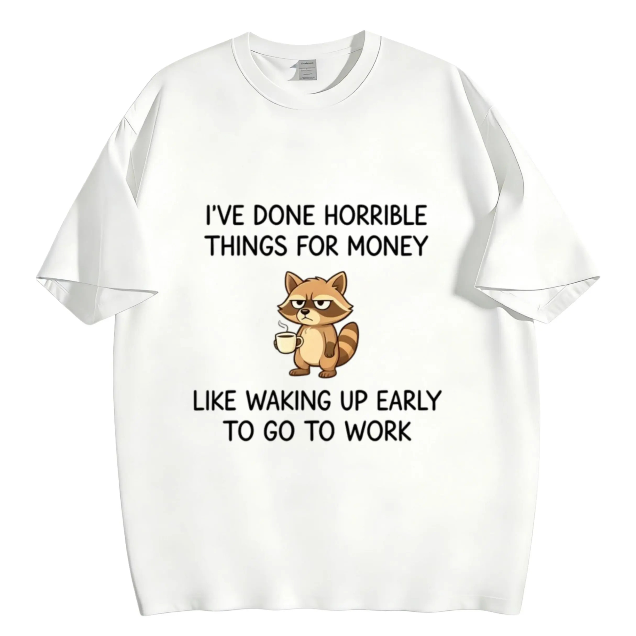 Our eye-catching front graphic features a grumpy, tired-looking raccoon holding a warm cup of coffee — the ultimate symbol of every early riser who’s dragging themselves to work. Pair that with the bold, relatable slogans: I’VE DONE HORRIBLE THINGS FOR MONEY and LIKE WAKING UP EARLY TO GO TO WORK, and you’ve got a design that speaks directly to the heart of every office worker, student, and anyone who’s ever struggled to get out of bed for a paycheck.