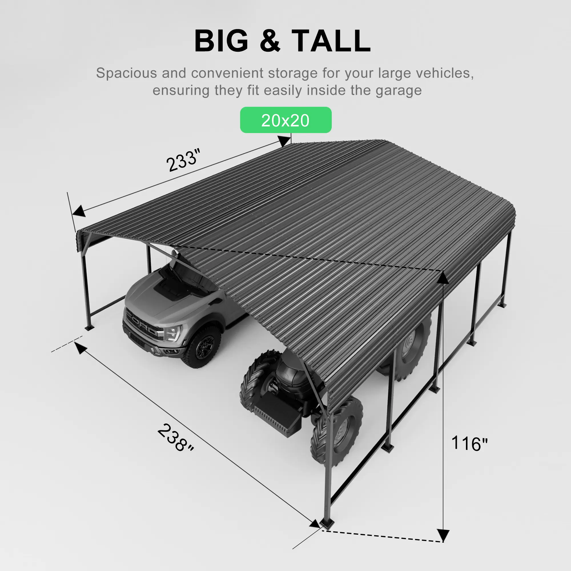 MNLR 20x20 FT Metal Carport is designed to provide practical outdoor coverage for vehicles and equipment. Built with a galvanized steel frame, this outdoor shelter offers a sturdy structure for everyday use in open outdoor spaces. The spacious 20x20 FT size works well for cars, pickup trucks, boats, tractors, and other large items.