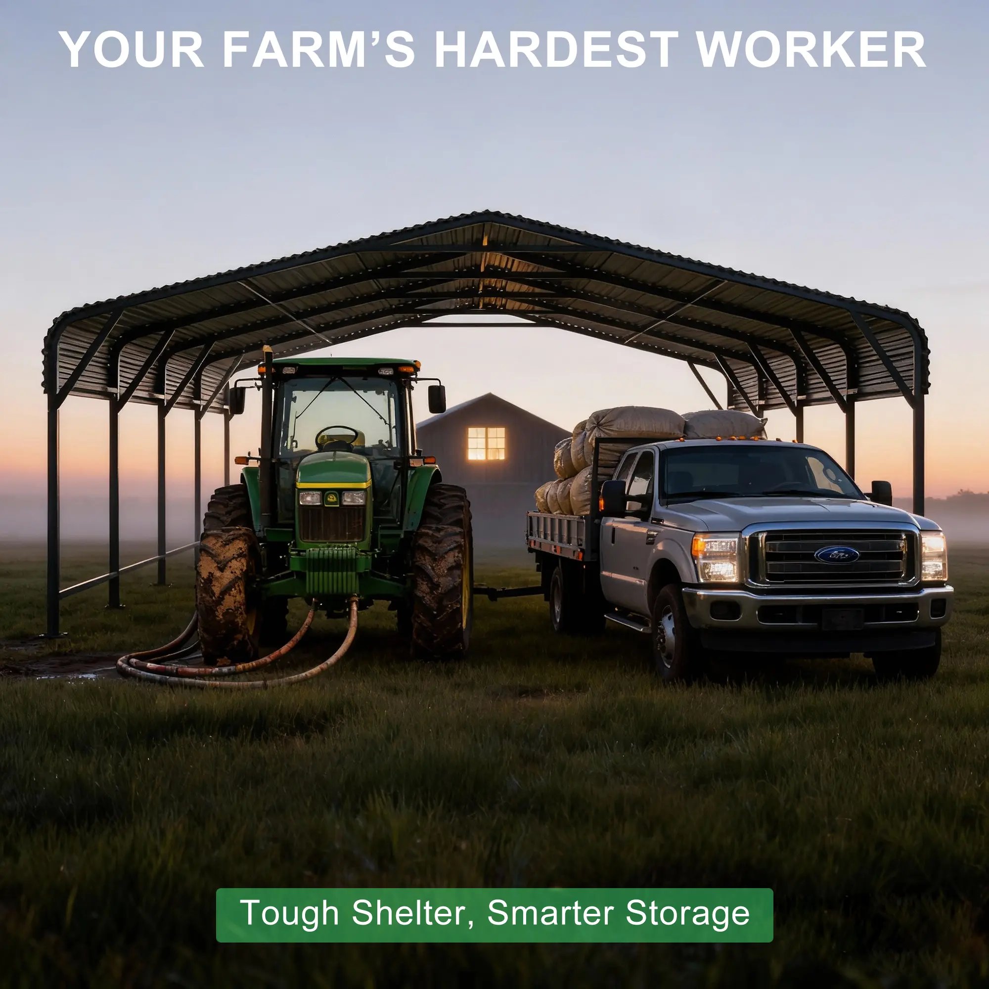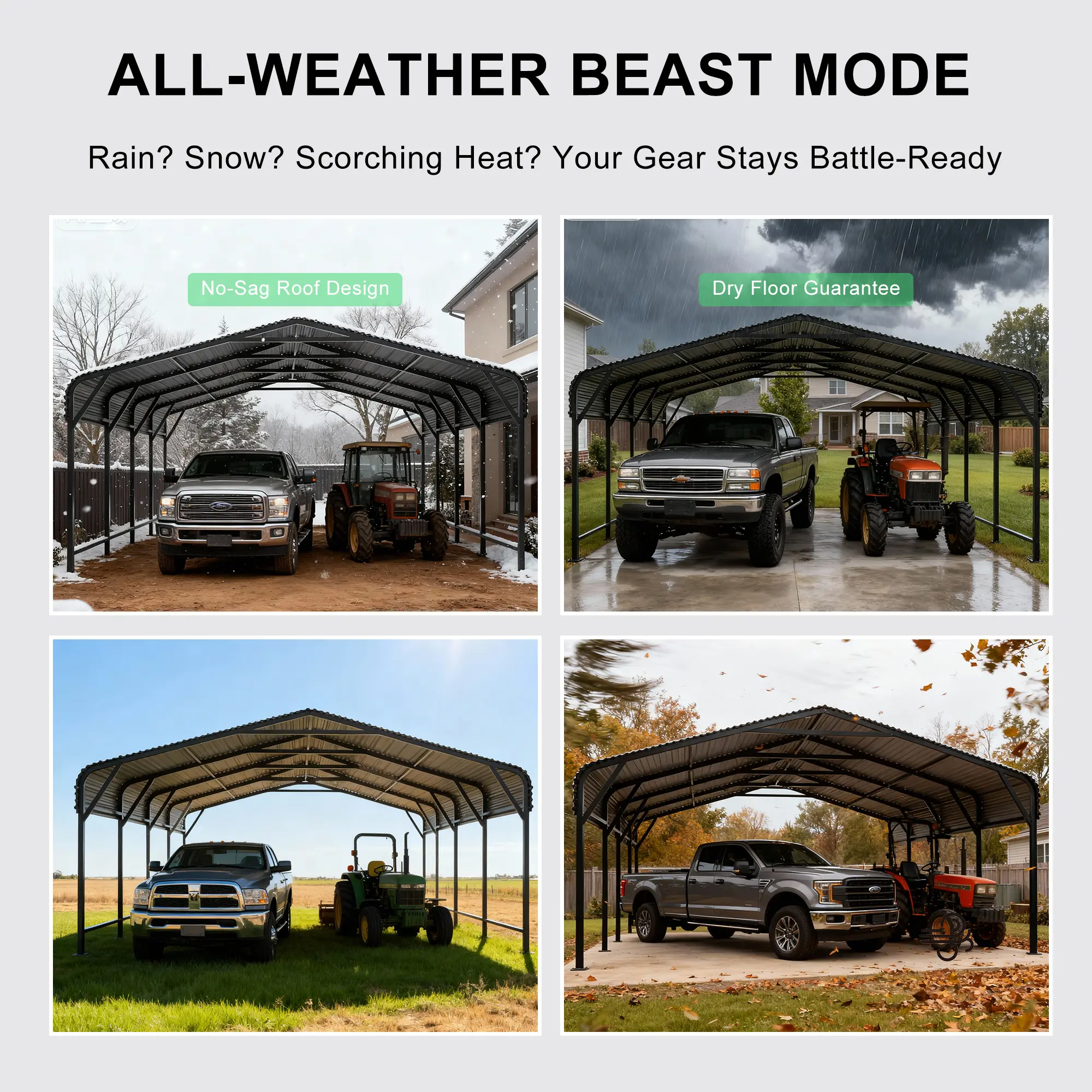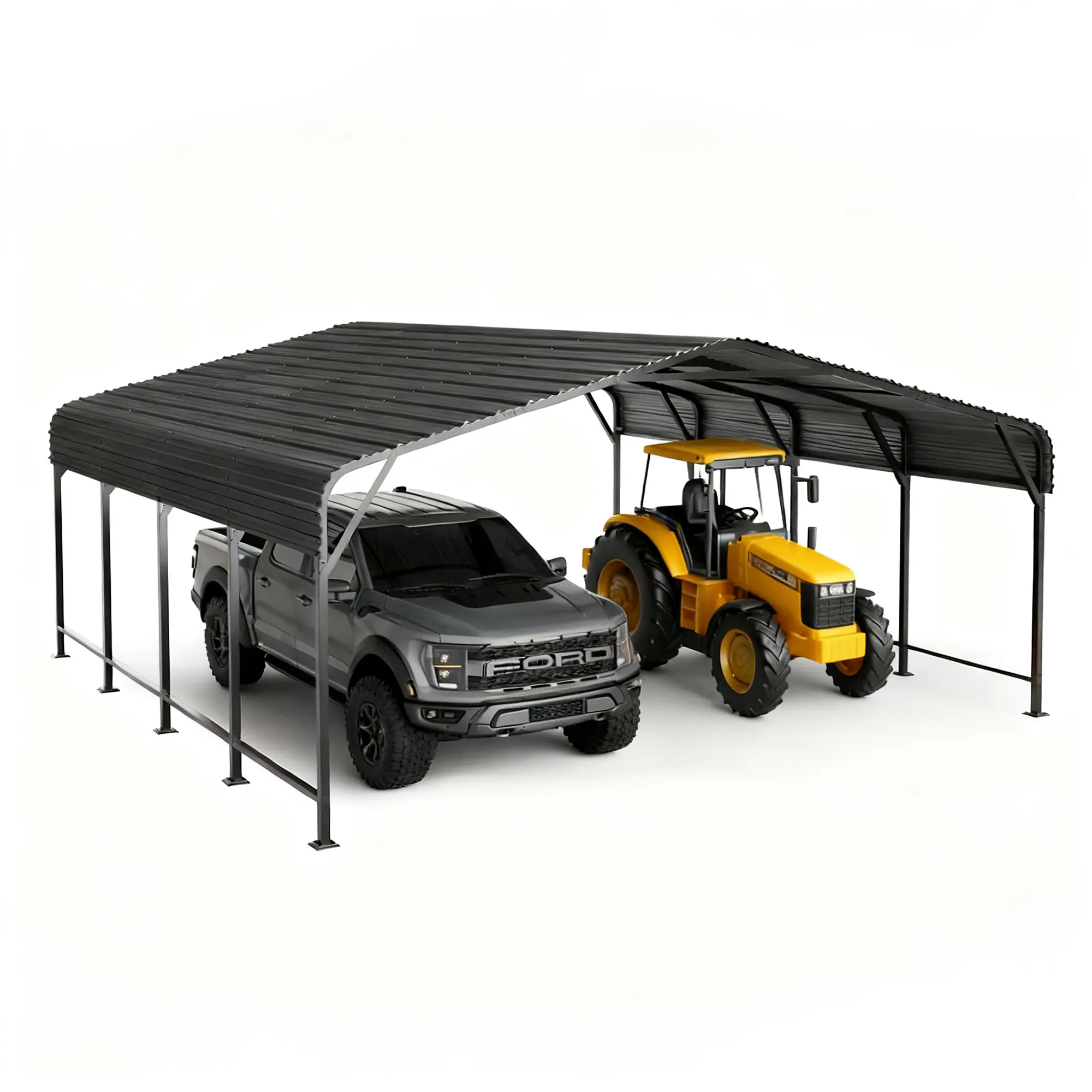 This metal carport is suitable for a variety of outdoor uses, including vehicle coverage, equipment storage, and backyard utility shelter. With its clean design and large coverage area, it can be used in residential or farm settings where extra covered space is needed.
