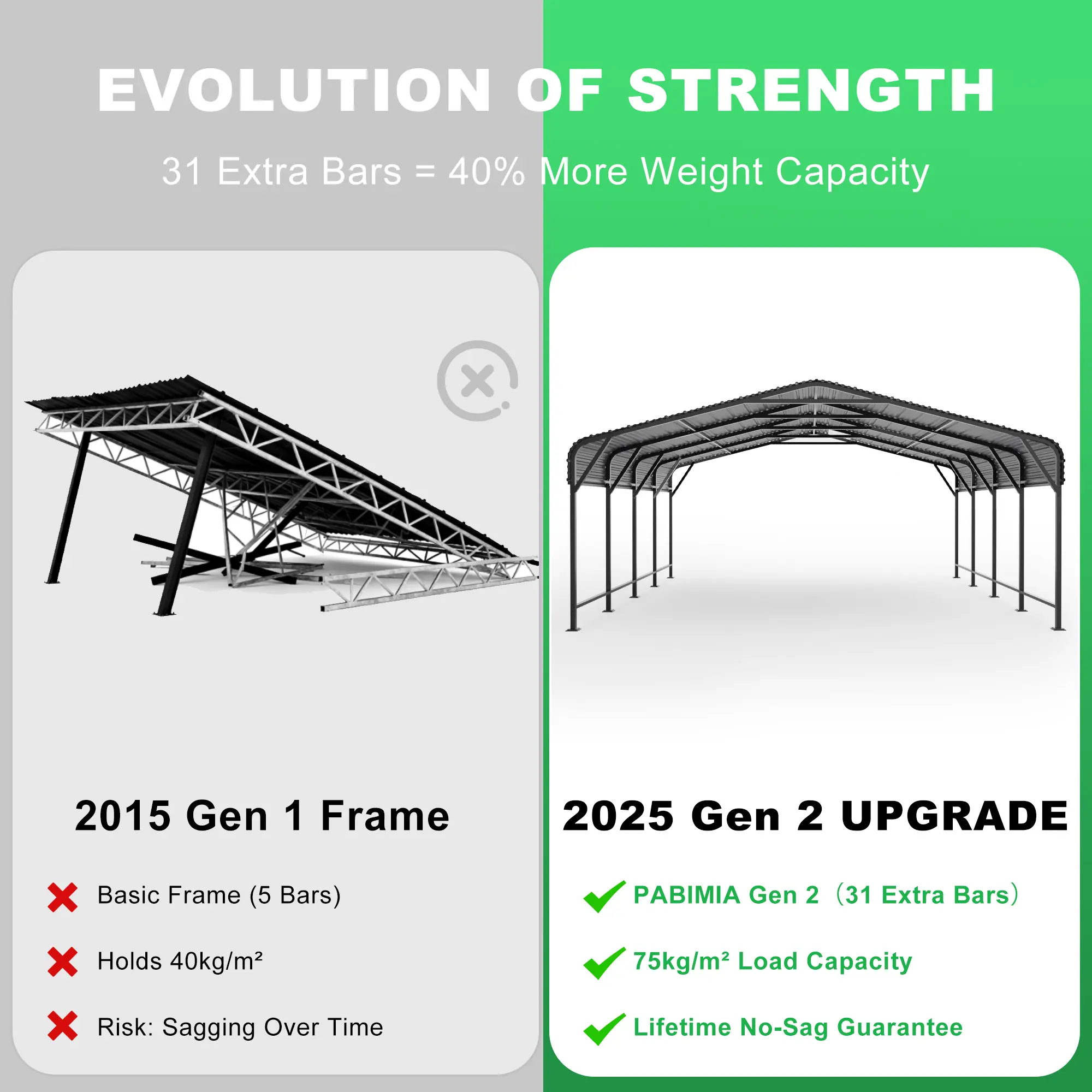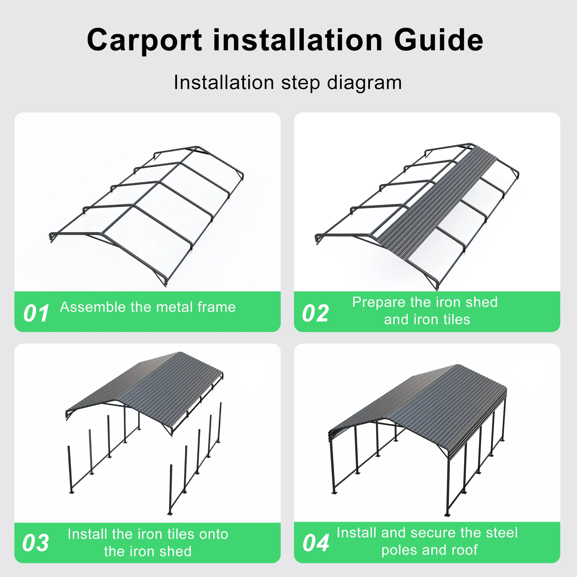 The open-side design allows easy access from multiple directions and gives you flexible space for parking or storage. A bolt-together structure with pre-drilled components helps simplify the installation process, while the adjustable leg design can assist with setup on different ground conditions.