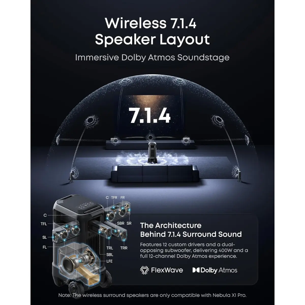 ·Wireless Dolby Atmos 7.1.4: Experience powerful, room-filling immersion with 400W Wireless Dolby Atmos 7.1.4 audio that places you at the center of every scene for truly cinematic sound.