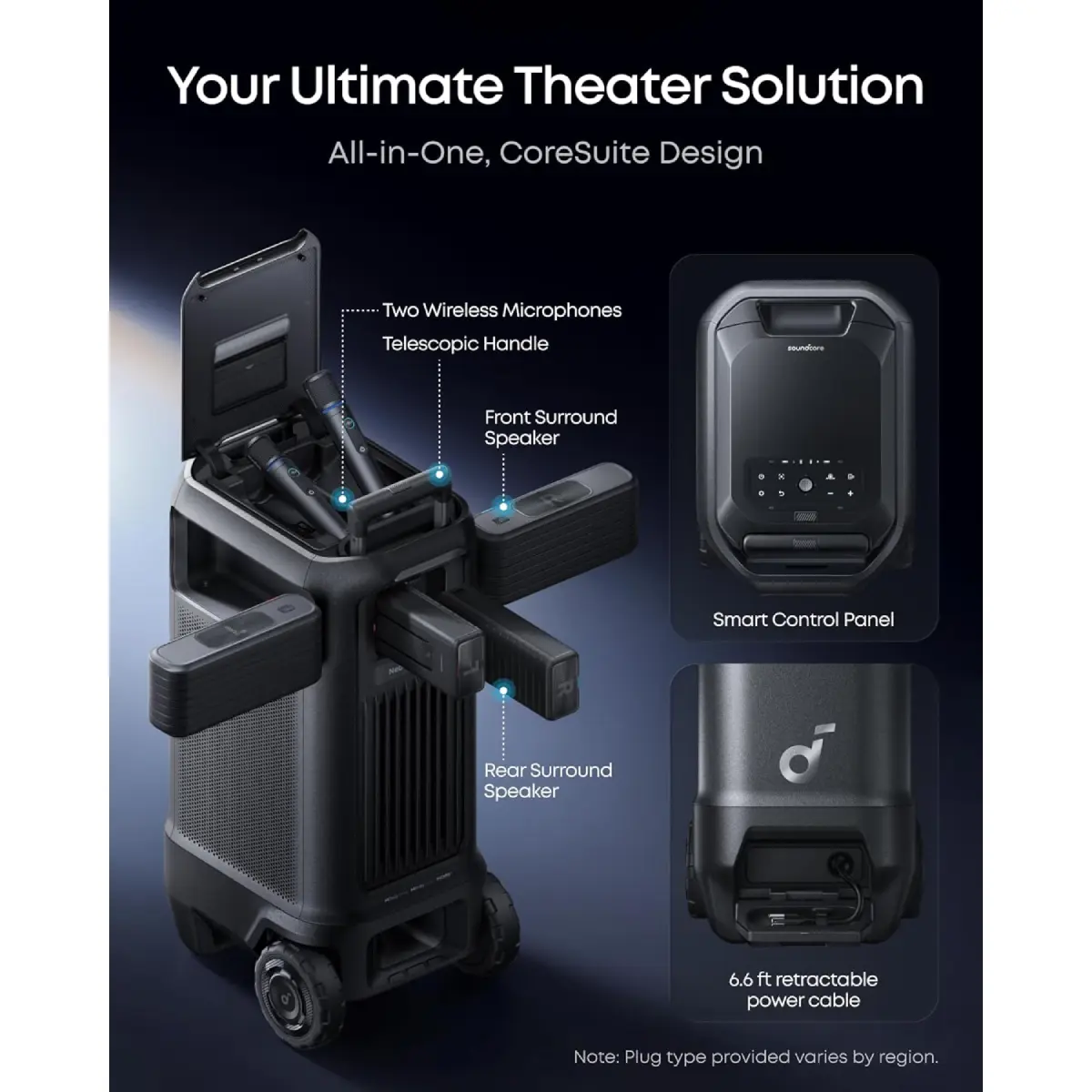·All-in-One Mobile Theater: A complete setup combining a 4K projector, wireless 7.1.4 system, and dual microphones. Built-in wheels and a telescopic handle make it effortlessly portable.