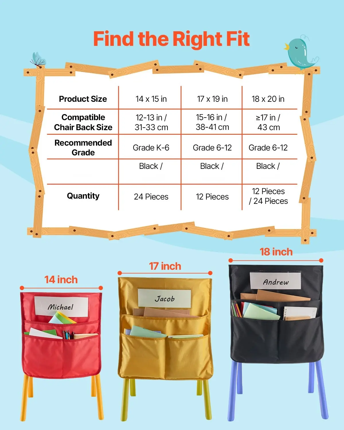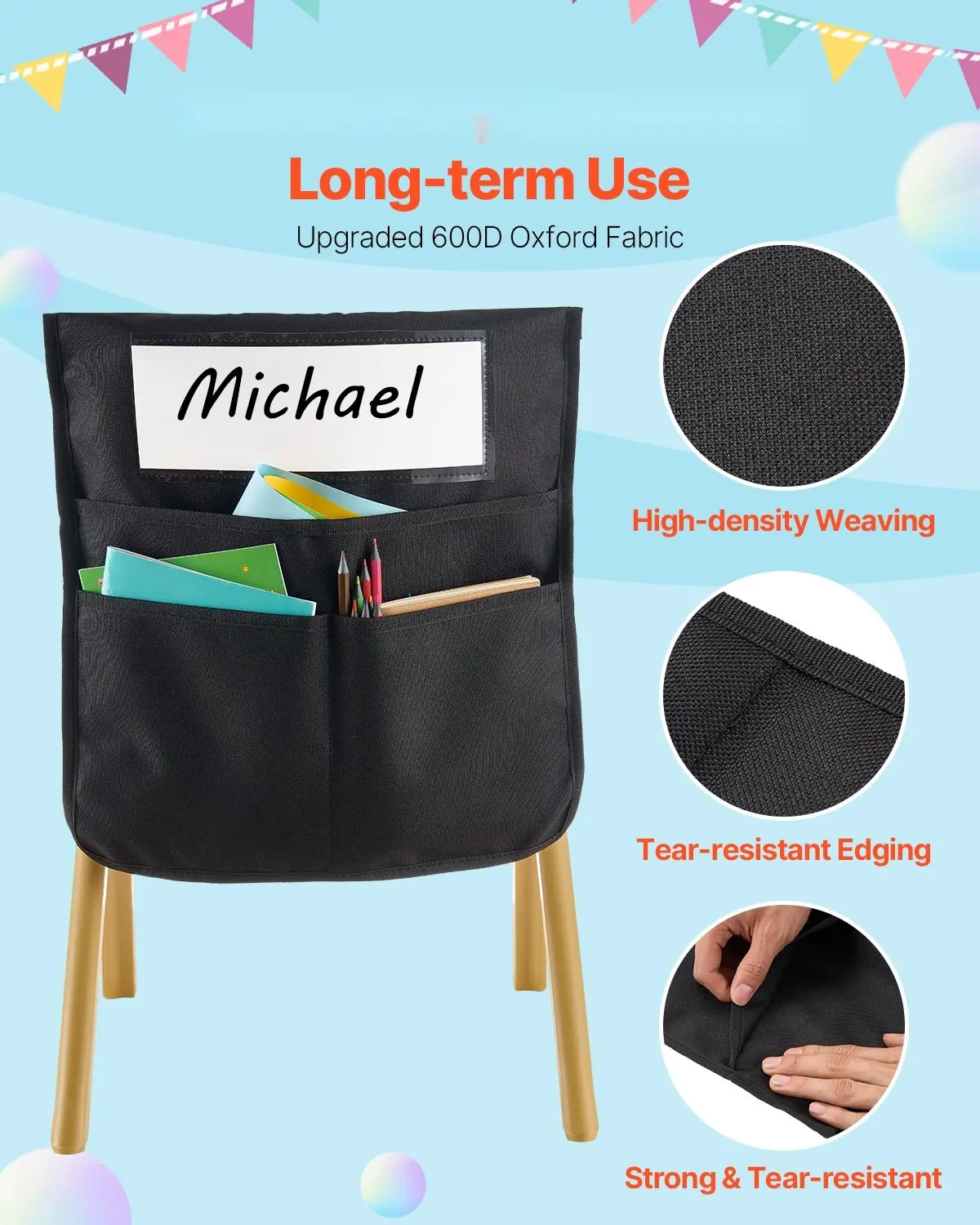 ·12-Piece Chairback Pocket Set: Includes 12 black chair pockets with name tags, ideal for Grade 6-12. Each 17 x 19 inches bag fits 15-16 inches chair backsâgreat for organizing desks and keeping everything within reach!