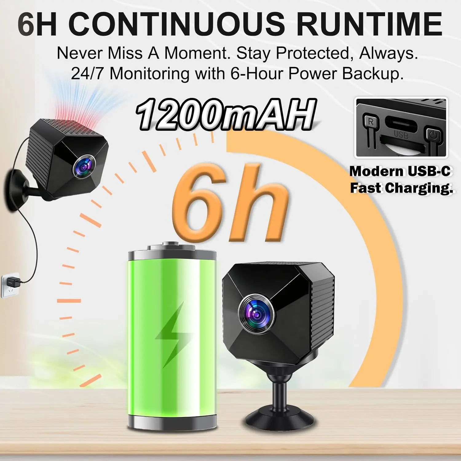 6H Extended Battery & Advanced Cooling: This mini wireless camera uses a 1200mAh battery to deliver up to 6 hours of continuous use, lasting longer than many ordinary mini cameras.The upgraded heat-dissipation design helps this small camera stay cool and stable, making it a reliable choice for long-term indoor monitoring and home security.