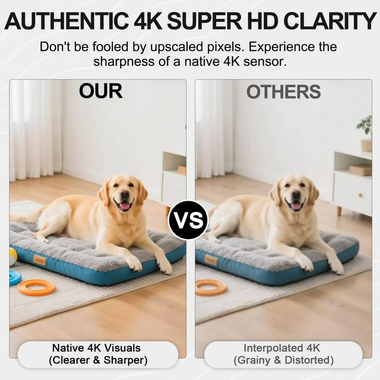 4K UHD Visuals & No-Glow Night Vision: Capture more detail with true 4K Ultra HD video.As a compact nanny cam, it uses invisible IR night-vision LEDs to record clear black-and-white footage in dark rooms without a distracting red glow.Ideal as an indoor camera to help you keep an eye on babies, pets, or elderly family members day and night.