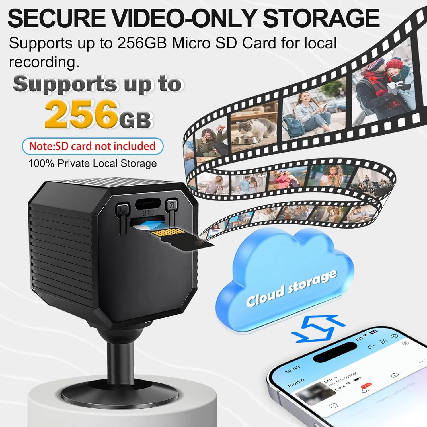Fast Bluetooth/WiFi Setup & Dual Storage Options: Get your small security camera wireless online in minutes with Bluetooth-assisted WiFi pairing-no complicated steps or tech skills required.Supports Micro SD cards up to 256GB (card not included) and optional cloud backup, so your indoor footage has flexible, secure storage options.