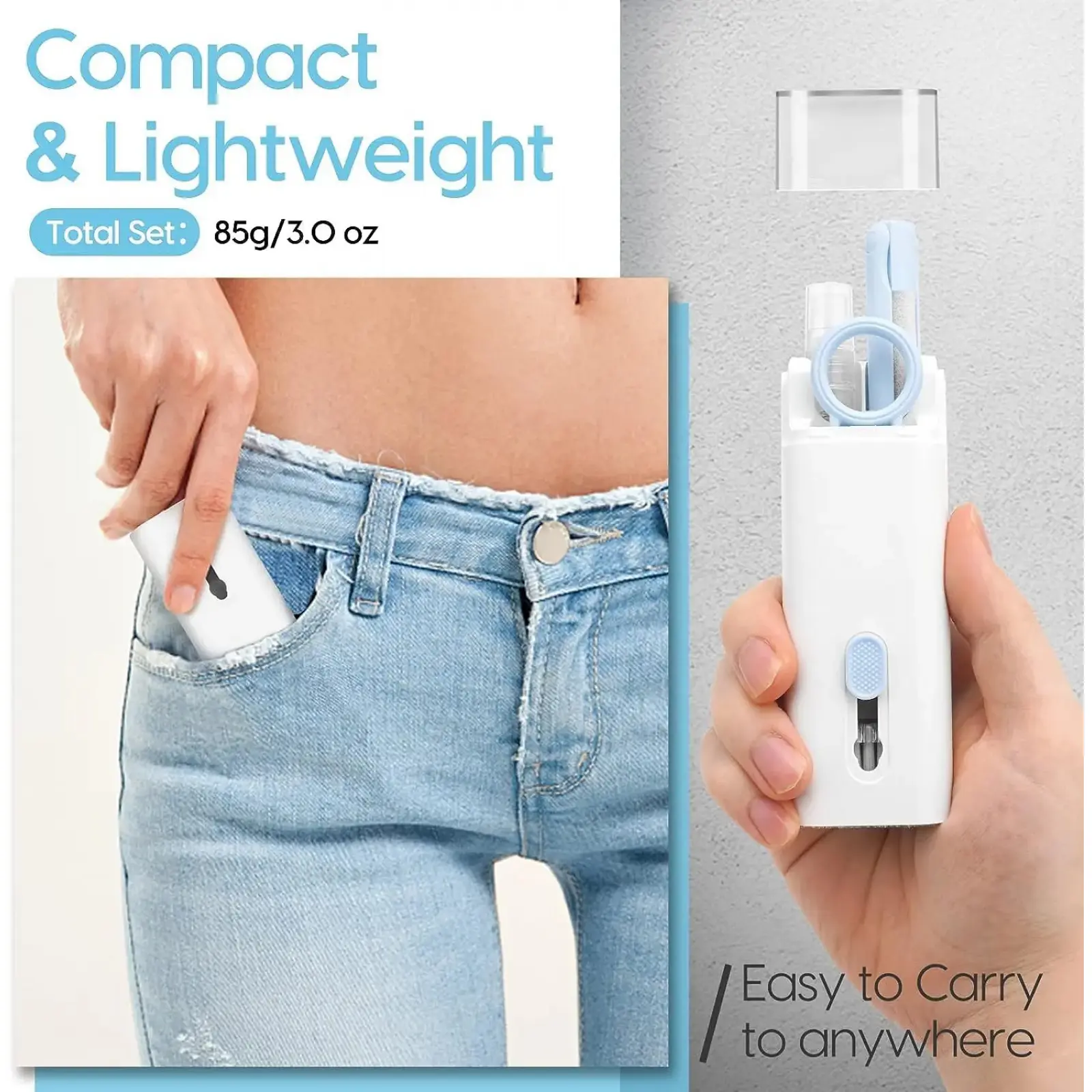[7 in 1 Multifunctional Cleaner Kit] electronic cleaning kit includes a cleaning pen for Airpods with silicone tip, mini brush and flocking sponge brush; high-density soft brush, cleaning spray bottle(empty), fiber fleece swipe and keycap buckle.