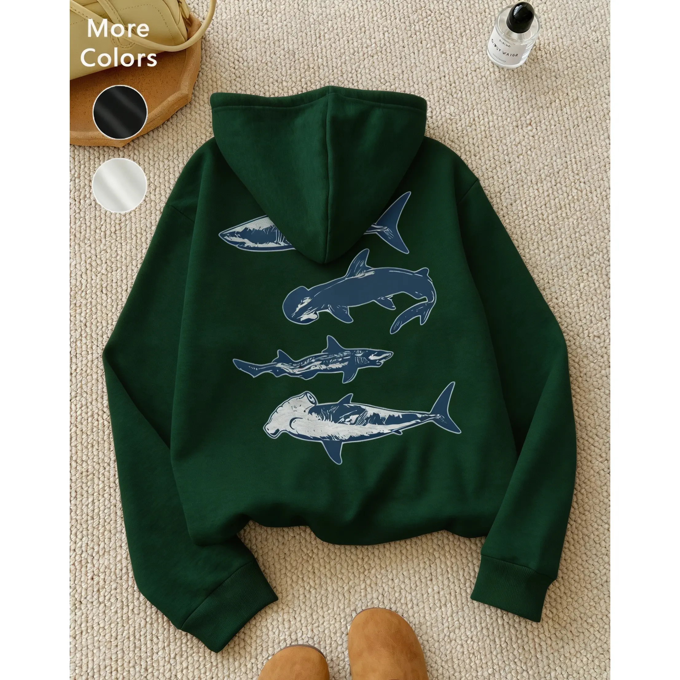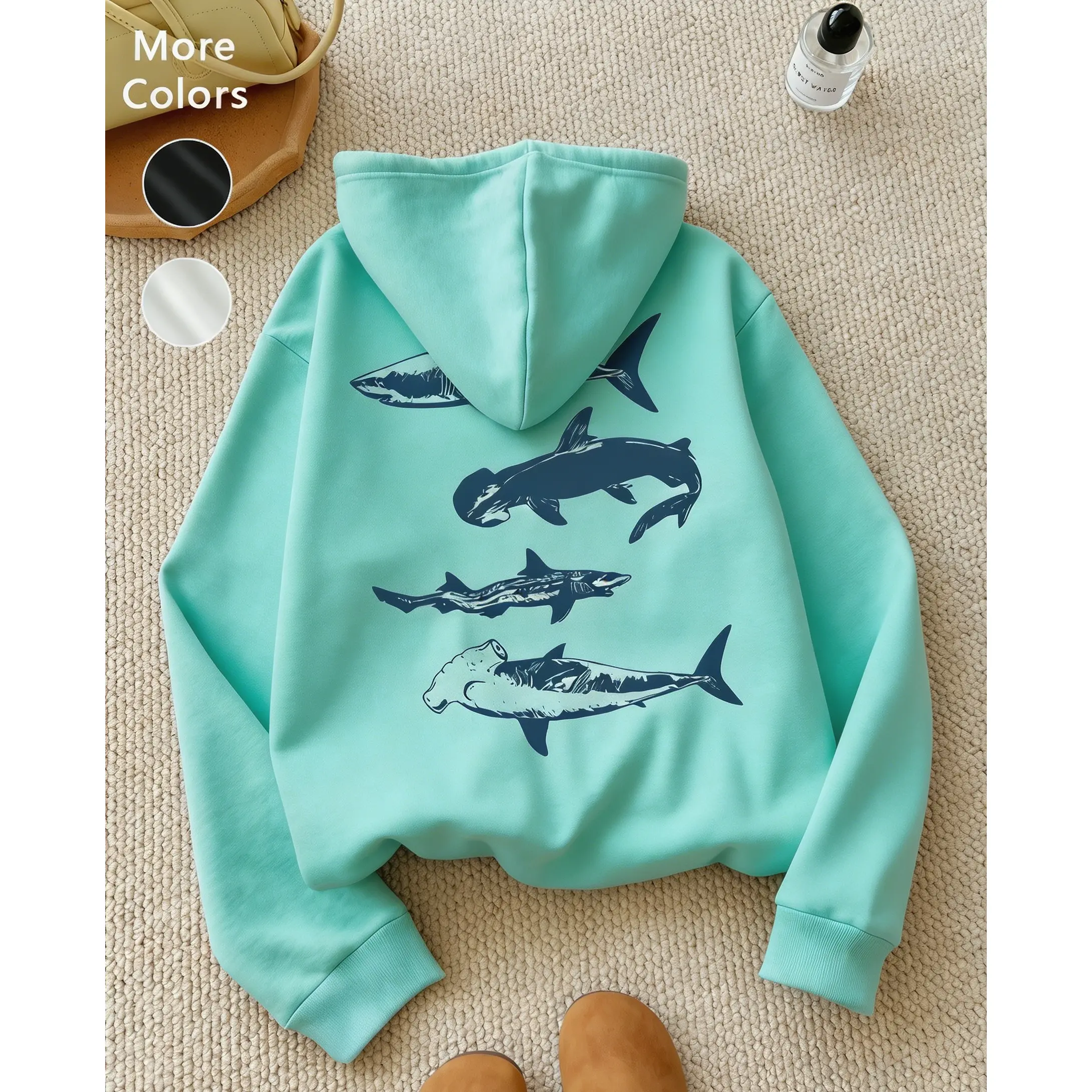 Women's Wool Aesthetic Hoodie, Loose Long-Sleeve Pullover for Autumn and Winter, Shark Print Casual Daily Wear, Unisex Fashion Top
