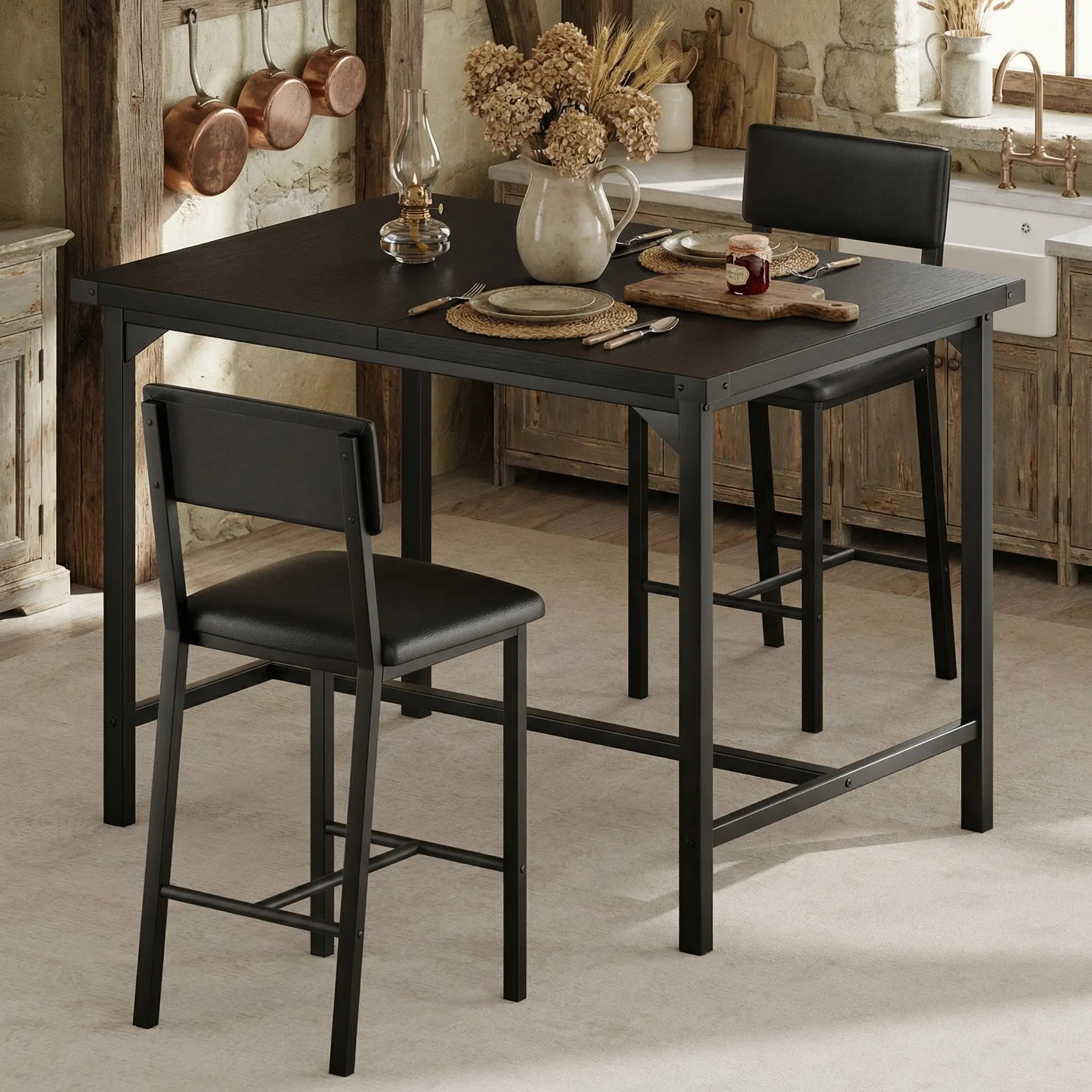 · 【Reinforced Metal Corners】This space-saving dining table set for 2 comprises a modern counter-height dining table and 2 upholstered bar chairs—ideal for enjoying meals or beverages with friends or family. Sturdy metal corner guards help protect the set from daily use, keeping it in excellent condition. The blend of an industrial-inspired design and elegant wood grain effect adds modern appeal to any room.