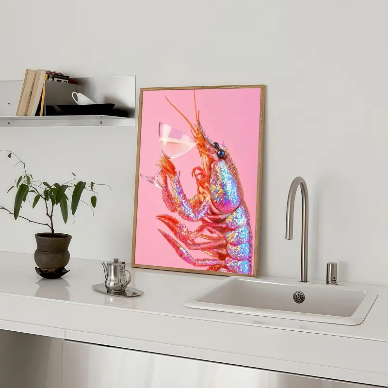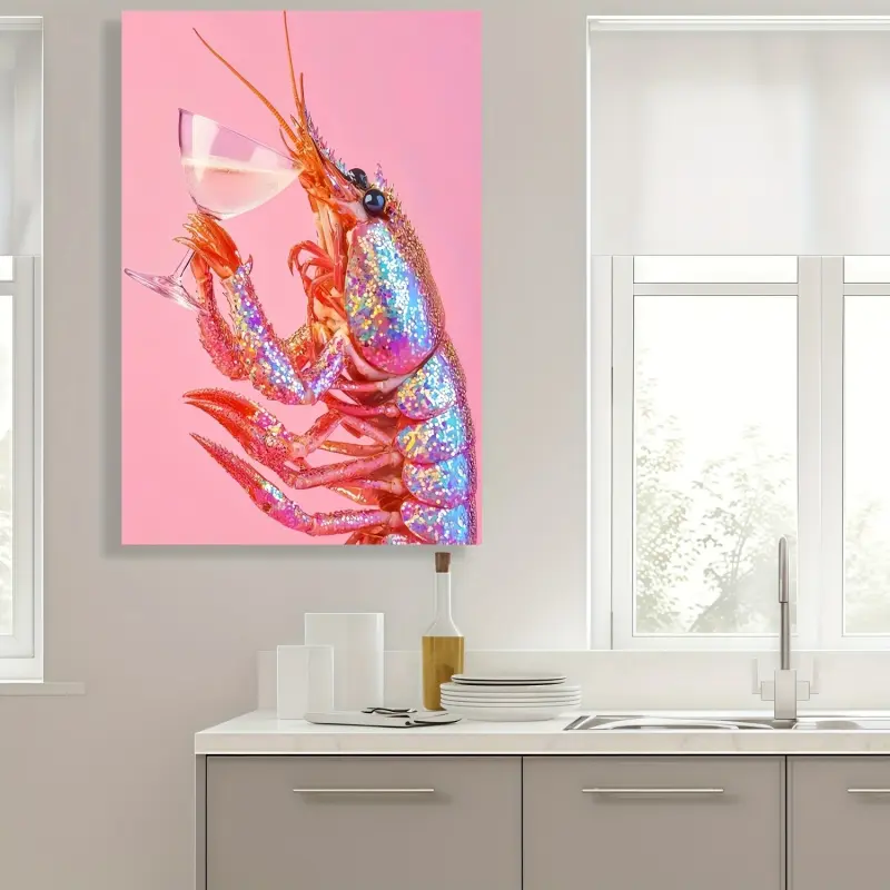2D Flat, 2D Flat, A Vibrant Canvas Poster Featuring a Crayfish And Champagne, Perfect for Modern Wall Decor in Various Spaces Such As Your Home, Bedroom, Living Room, Kitchen, Bathroom, Or Office