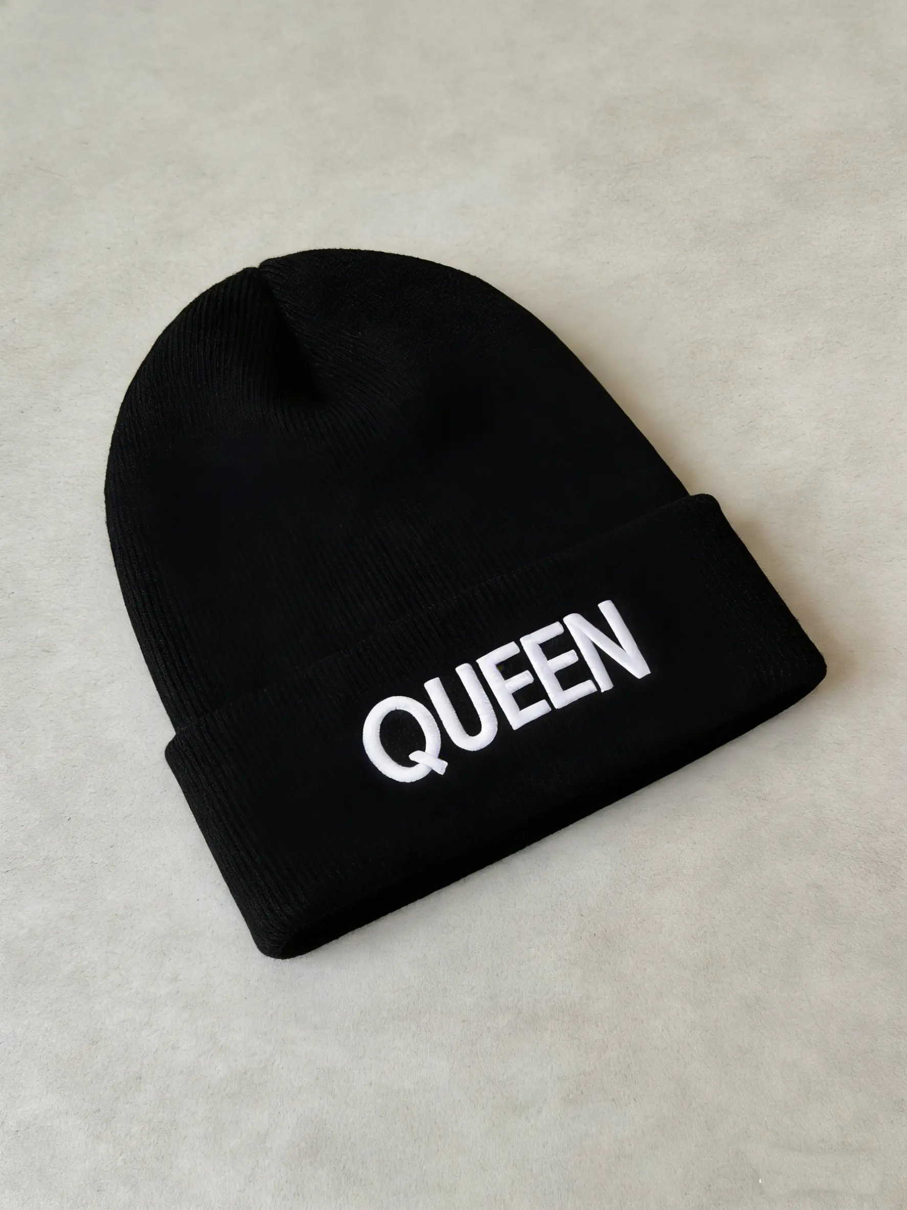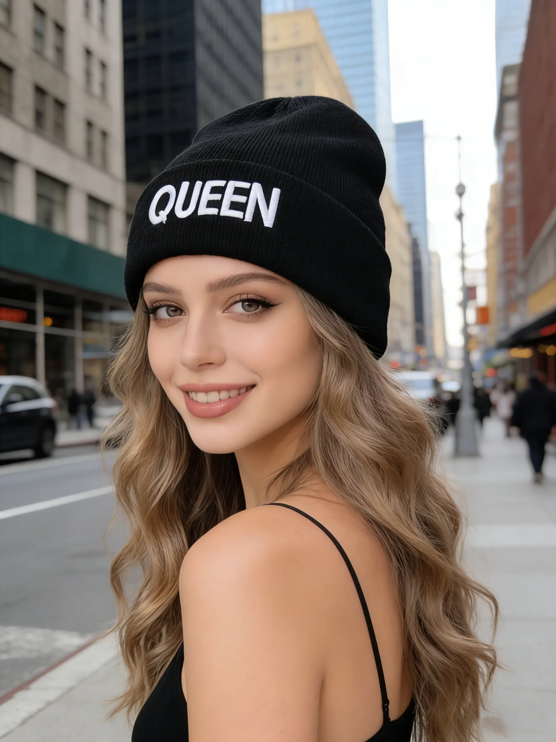 Elevate your street style with this iconic black knit beanie featuring bold white "QUEEN" lettering. Designed for fashion-forward women and teens, this hat is the ultimate accessory to make a statement.