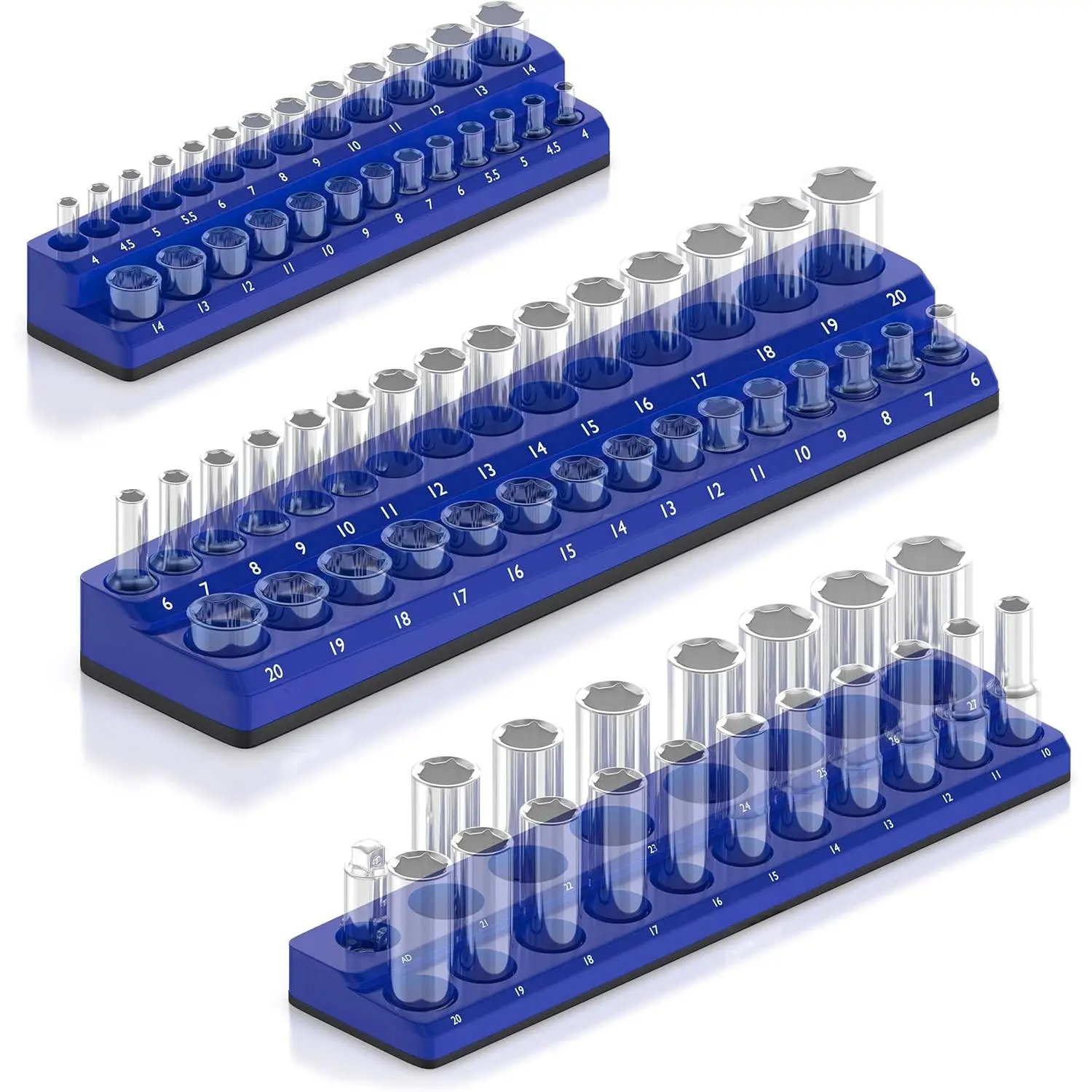 5. Magnetic Socket Organizer - 3-Piece Drive Metric Socket Holder Set with Strong Magnets - Professional Tool Holder and Organizer - Stores up to 75 Sockets - Blue - Part: 1149
