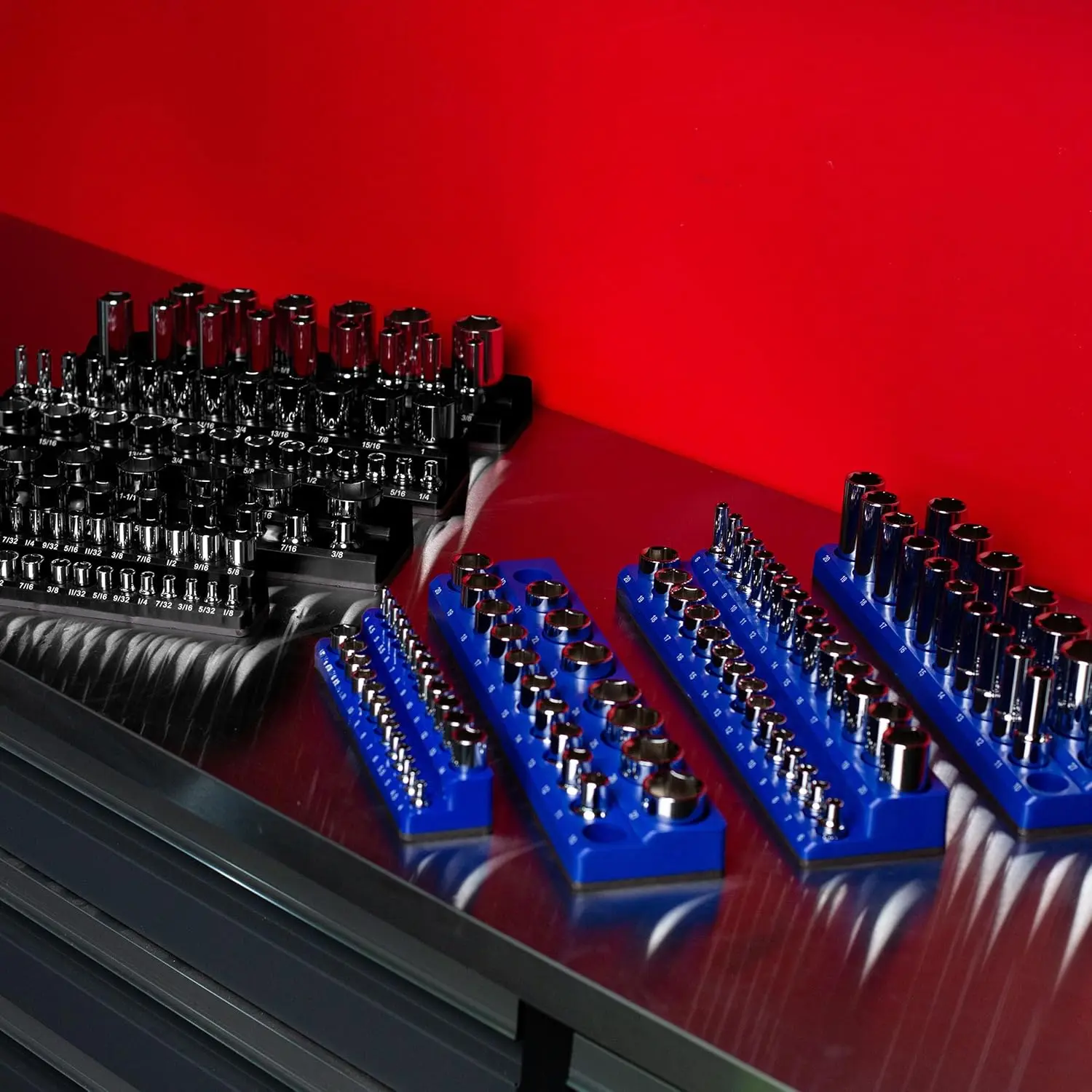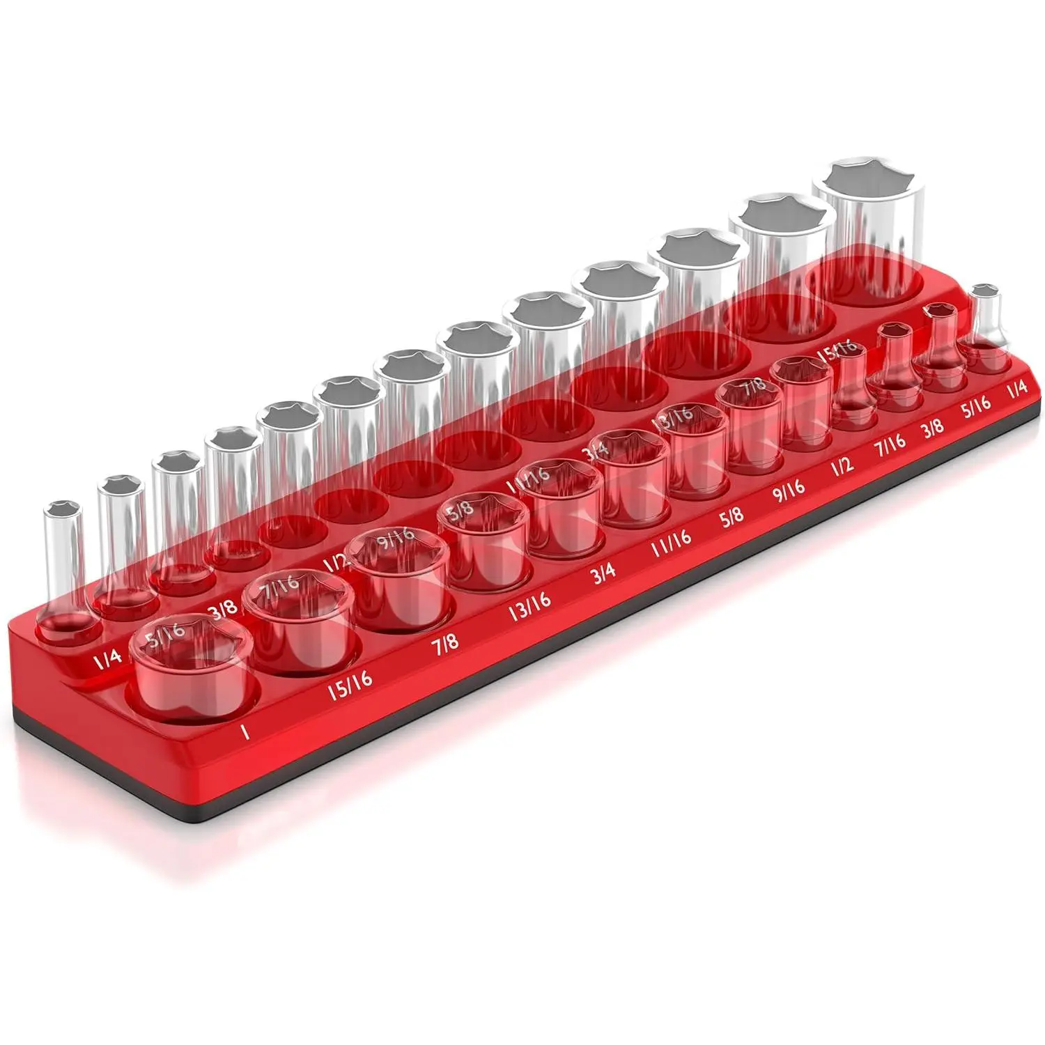 STORE YOUR SOCKETS ANYWHERE - Capable of storing your sockets in your drawer, or mounted to the side of your toolbox.The strong ferrite magnet base keeps your sockets in the tray and the tray secured to any steel surface (YES, even upside down).