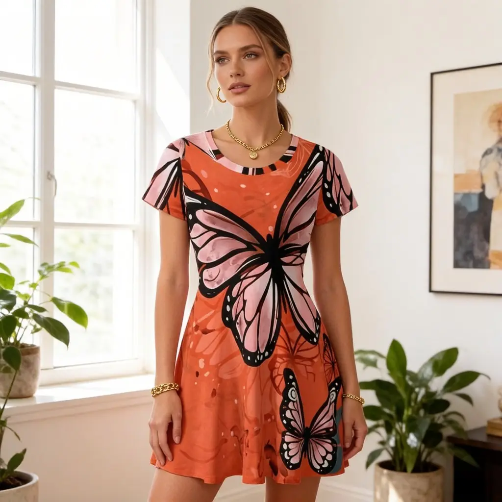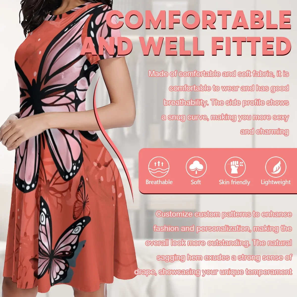 This women's summer dress features a short-sleeve and round neck design, with a length above the knee. The flowy and loose fit flatters your figure perfectly, effortlessly hiding your abdomen while keeping you comfortable and stylish. No matter where you go, you’ll stand out as a fashion focal point. It allows you to customize your look for any occasion—from casual days out to chic date nights, this dress has got you covered.