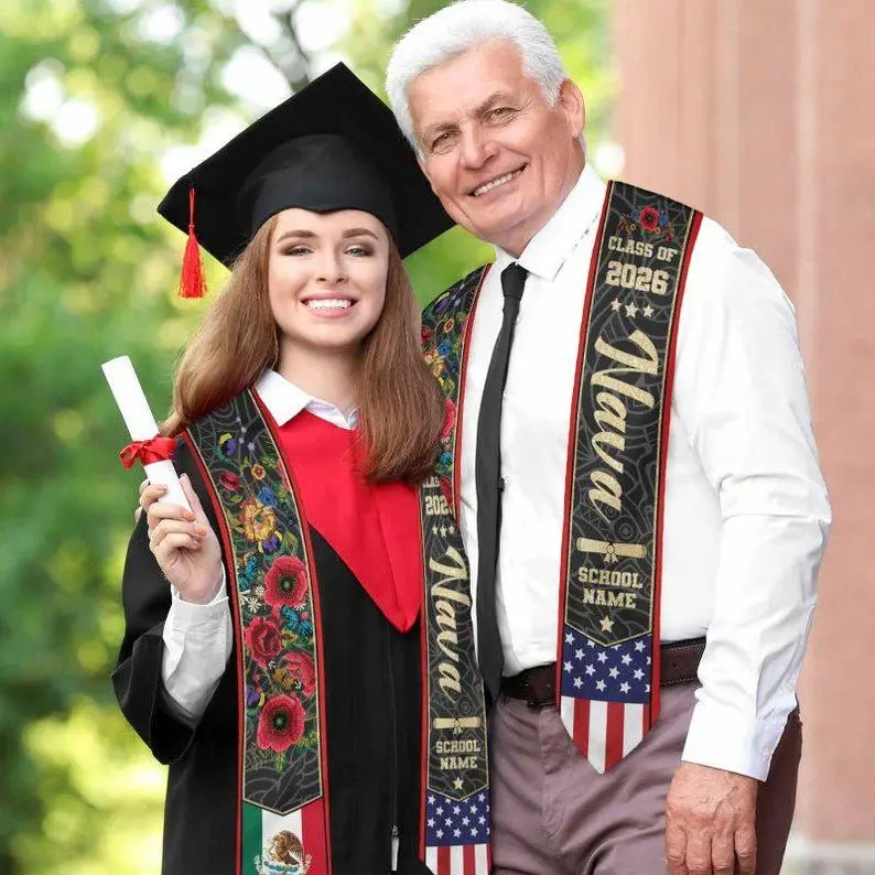 Custom Mexican Graduation Stole: Two Flag Design, Class of 2026 Graduation Stole