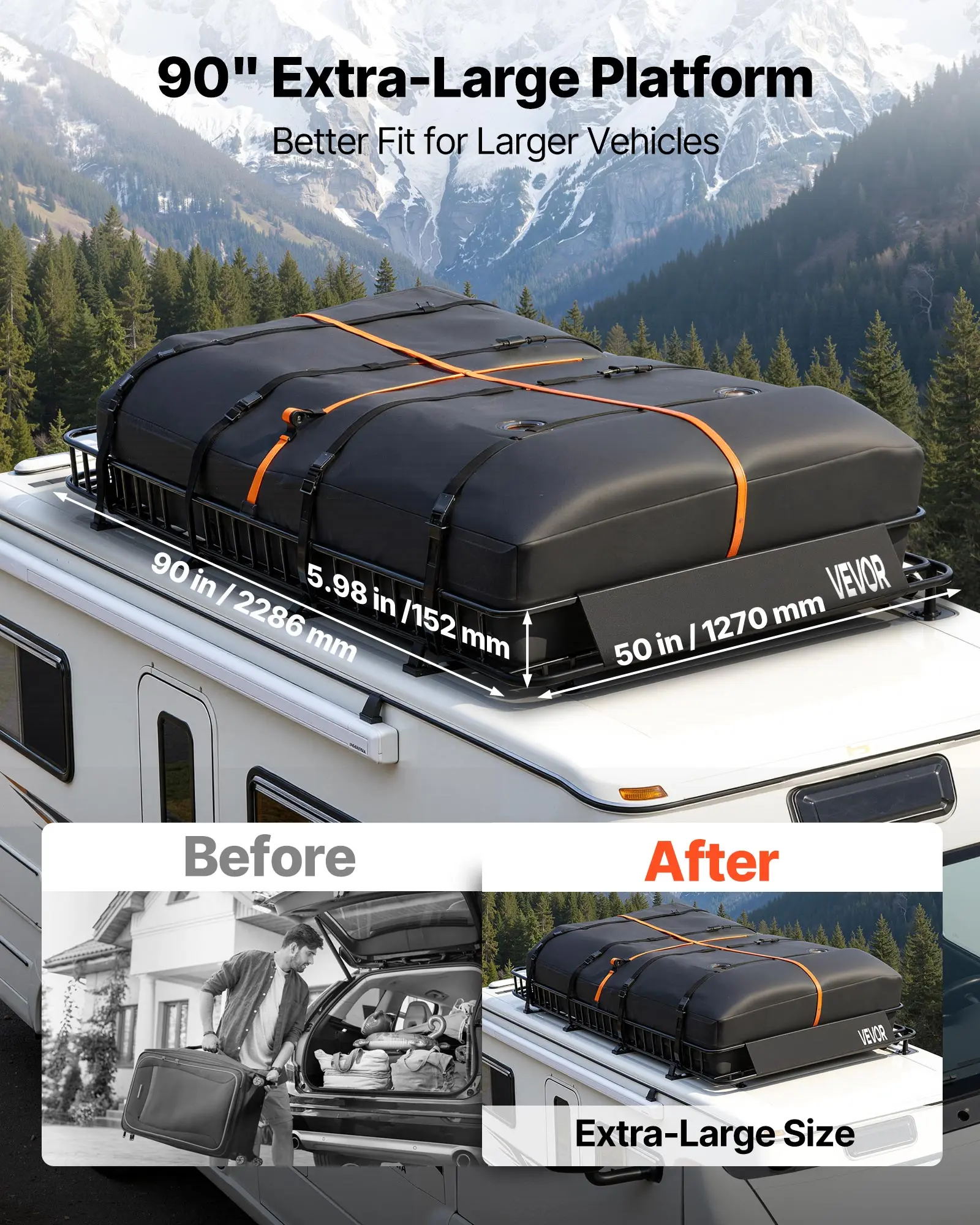 Maximize Cargo Space: This roof rack cargo basket features an extra-large platform with a waterproof Oxford cargo bag, moving luggage and camping gear to the roof with ease. It helps keep the interior more spacious and comfortable for long trips