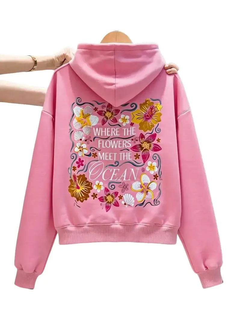 Men’s and women’s Y2K floral embroidered hoodie — aesthetic preppy graphic sweatshirt; cute hood design featuring “Where Flowers Meet the Ocean”; all oversized embroidery; suitable for Christmas, Halloween, and Thanksgiving; menswear tops; pullover long s
