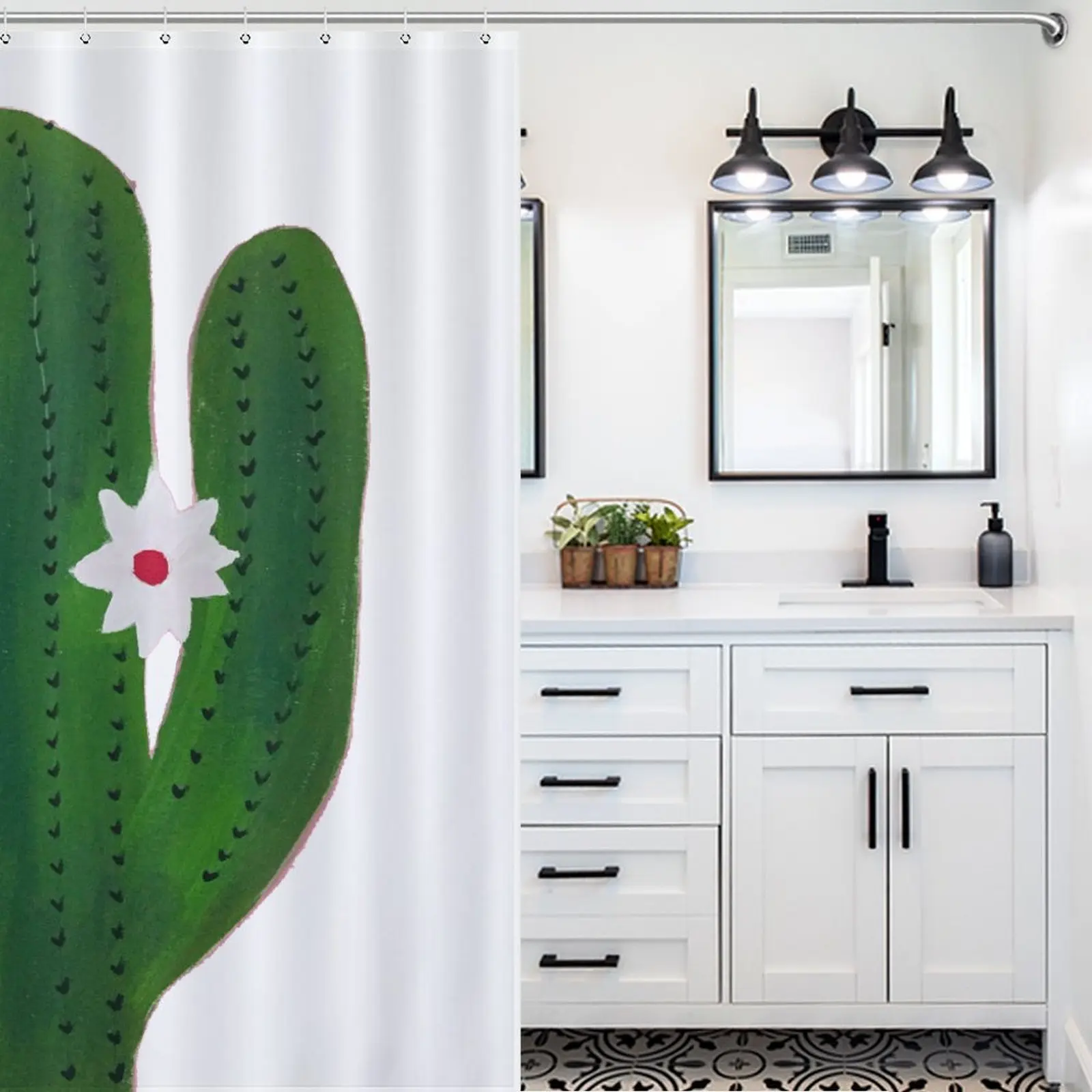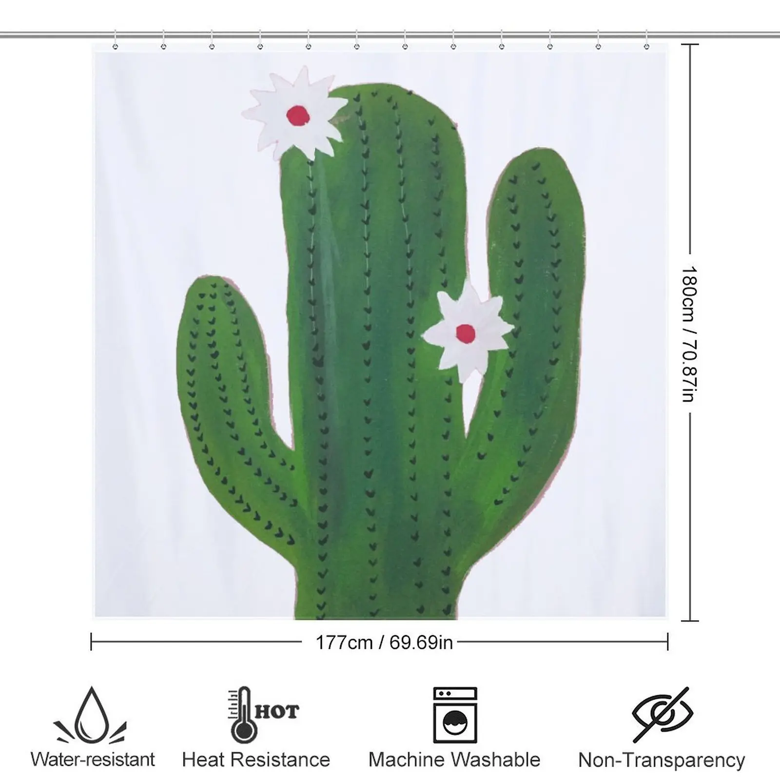 Cactus Flower Shower Curtain, Minimalist Green Cacti Waterproof Bath Curtain, Boho Desert Aesthetic Bathroom Decor, Cute Cactus Bath Accessory with Hooks