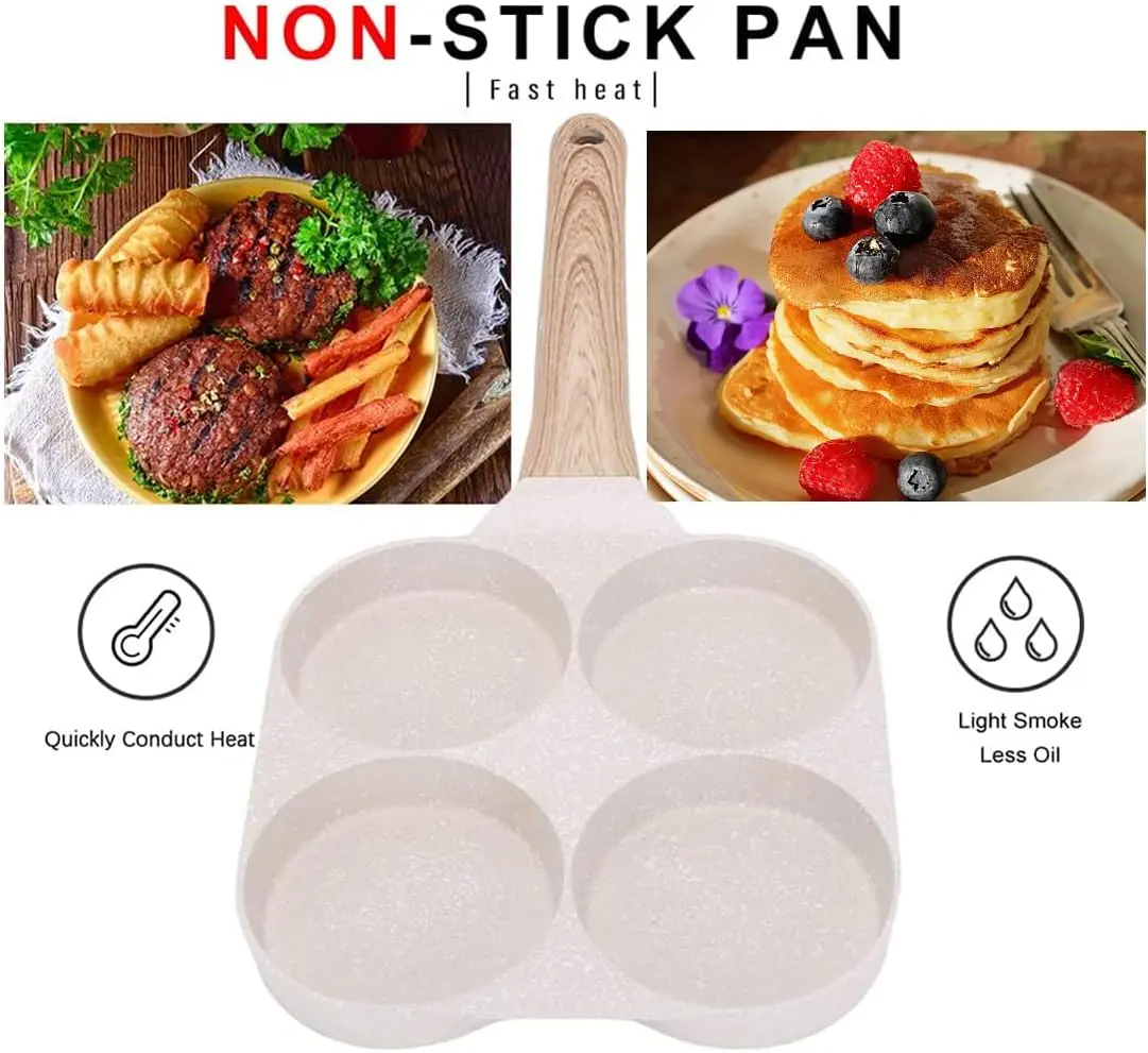 ·4-Cup Egg Frying Pan - This egg frying pan uses a four-hole design, which is perfect for cooking omelets, bacon, burgers, pancakes, etc. It can make cooking faster and easier, and save your time and energy for breakfast.